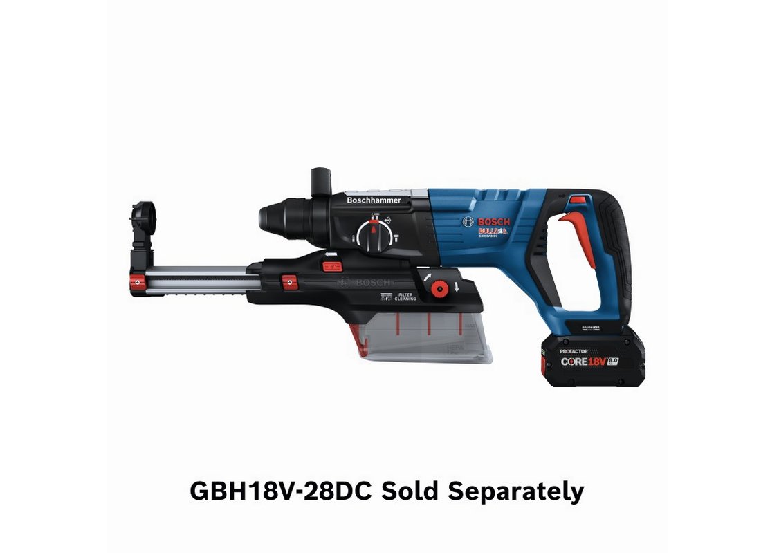 The GDE28D SDS-plus 1-1/8 In. Dust Collection Attachment allows users of the Bosch GBH18V-28DC 18V Bulldog™ to achieve maximum mobility around the jobsite with a dust-extraction solution, using only one battery. It has a filter cleaning mechanism to help remove excess dust and debris from the filter. It features a HEPA filter, helping users move toward compliance with OSHA silica dust regulations. The extractor mounts to the hammer, allowing use of the hammer’s fan to create suction in the extractor. This collector is activated through the engagement of the hammer trigger. This collector has auto power-on, providing vacuum suction automatically when drilling. It also has auto power-off, with a built-in two-second delay after releasing the hammer trigger, to allow collection of remaining dust. It comes with two Dust-Eye options (one small, one large) and a 4 In. extension. The large Dust-Eye option accommodates bit diameters up to 1-1/8 In. in diameter and the extension accommodates bit lengths up to 10 In. in length. The extractor has an aluminum guide rail for durability and smooth retraction of the Dust Eye during the drilling process. For convenience and flexibility, the dust container is transparent to check the actual dust level. It comes with a Dust Box Empty Flap. Simply open the flap on the back of the dust extraction unit to easily remove dust.