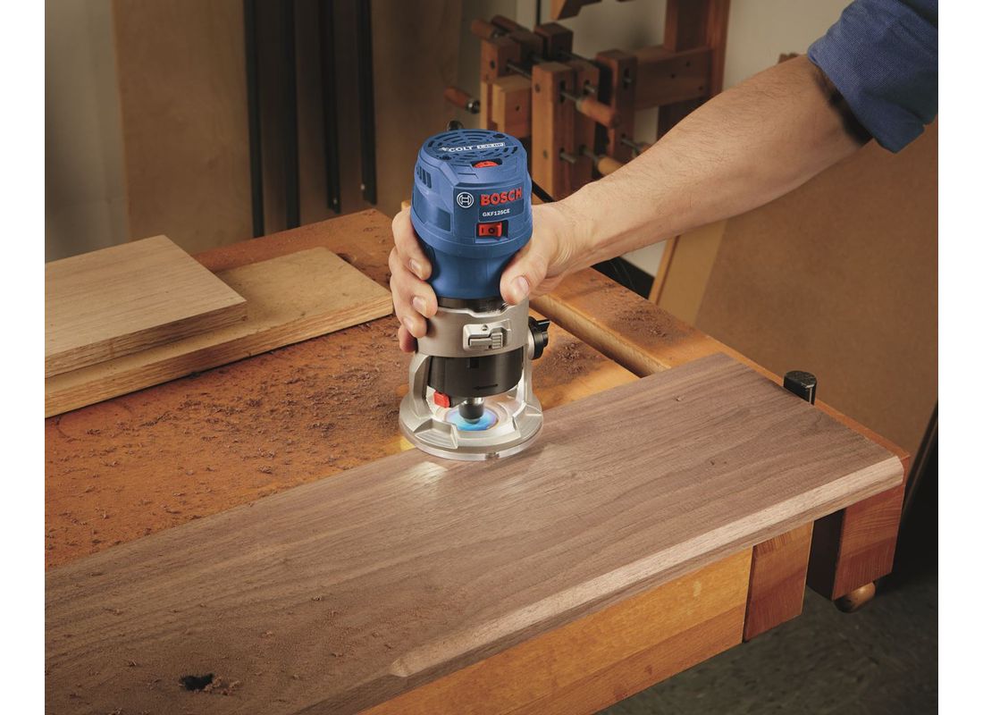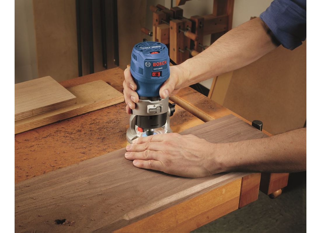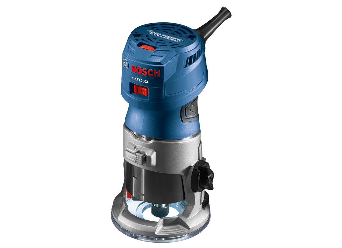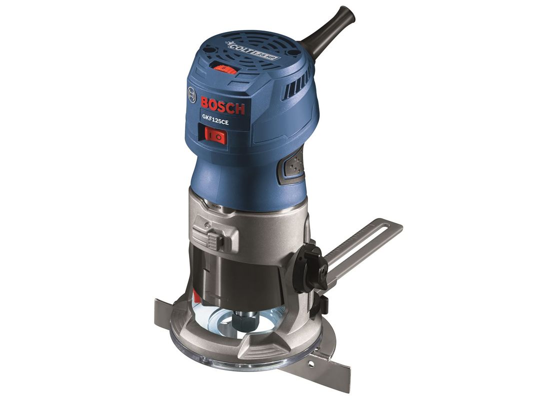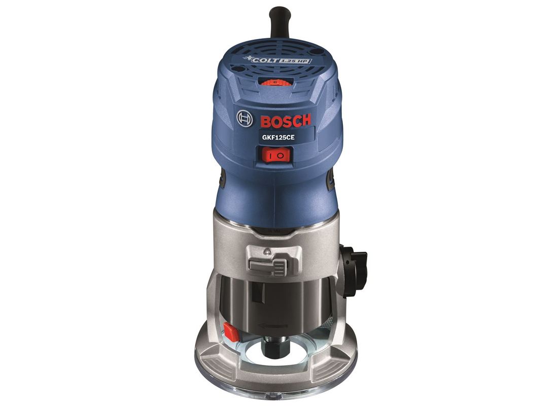 The Bosch GKF125CE Colt variable-speed palm-grip router with 1.25 horsepower (max) lets you feel the power in your hand. This Bosch Colt Palm Router has an ergonomic palm-grip design with soft-grip to make it very comfortable to hold, making it typically more convenient to use than larger routers. But it also has ample power, with a 1.25 HP (max) rating. Far more than a laminate trimmer, it’s the ideal tool for rounding-over deck planks and railings, hinge mortising, decorative edge forming, slot cutting, window cutouts, decorative inlays, laminate trimming and more. The motor features soft-start circuitry, a variable-speed dial and Constant Response circuitry to maintain speed under load. Its PR101 fixed base features macro- and micro-fine depth adjustment and a centerable round subbase for easy guidance. The GKF125CEN Colt Palm Router package includes the router, self-releasing collet chuck and a comfortable forged collet chuck wrench.