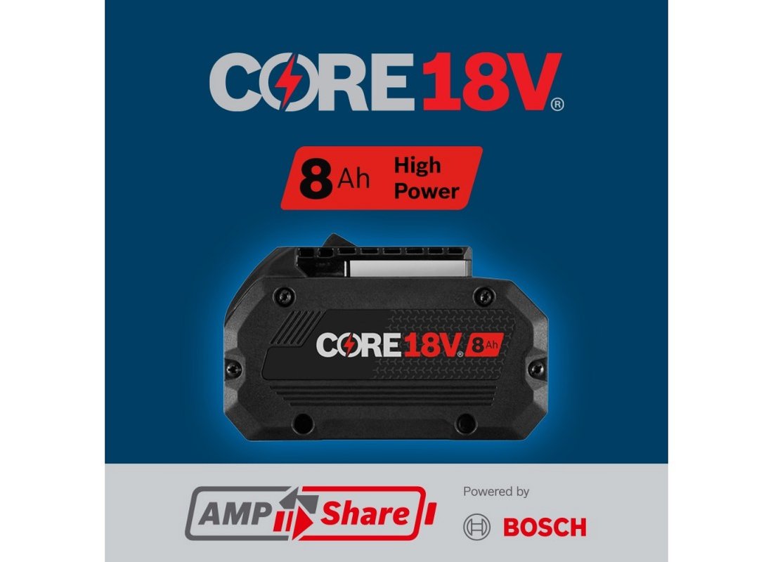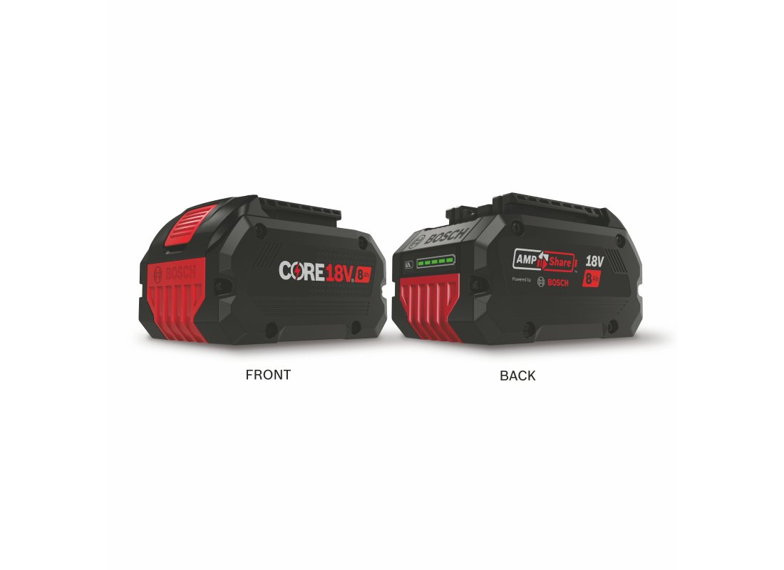 The Bosch CORE18V® 8 Ah High Power Battery delivers 50% more runtime and over 75% more power than the CORE18V® 4 Ah battery, powering high-demand applications. The GBA18V80 features two layers of enhanced 21700 cells for greater battery efficiency. The battery has Bosch-exclusive CoolPack™ 2.0 technology, which cools the battery faster and helps provide longer lifetime compared to Bosch 18V batteries without CoolPack™ 2.0. With its cutting-edge battery design – including copper end plates, power rails and a flexible circuit board – it offers reduced resistance and increased efficiency. It weighs only 2.14 Lbs., for the ideal balance of size, weight and power. It includes a charge-status Indicator with high resolution for clear visibility. This battery is engineered for 18V, and it's compatible with Bosch 18V tools. The GBA18V80 is optimized to drive Bosch PROFACTOR™ tools with BITURBO Brushless™ Technology, for power comparable to the most demanding corded tools. The battery is compatible with Bosch 18V chargers and the AMPShare™ System. The AMPShare™ System is a battery system designed to be multi-brand compatible across many cordless products to make managing your work day easier.