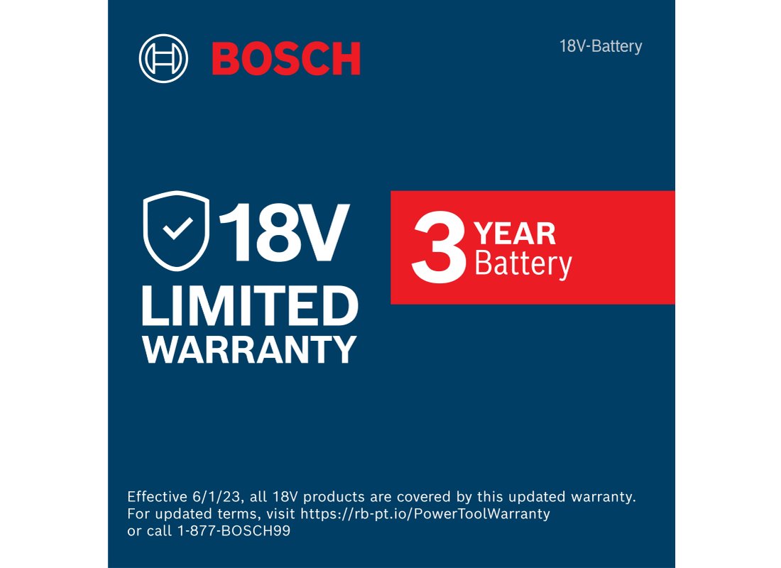 • Bosch 18V batteries are covered by a three year limited warranty - for details, visit https://rb-pt.io/PowerToolWarranty or call 1-877-BOSCH99