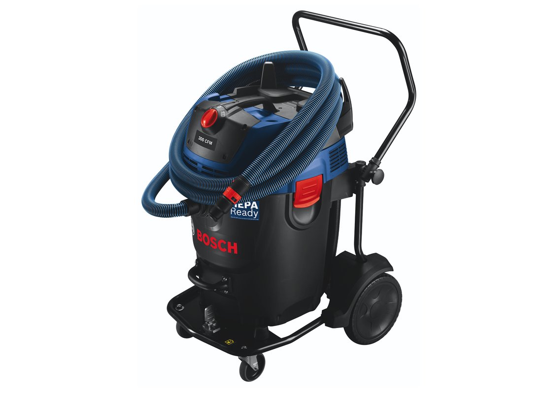 The Bosch 300-CFM Dust Extractor delivers the high-performance cubic-feet-of-air-per-minute (CFM) rate for maximum dust extraction for heavy-duty concrete construction applications such as concrete cutting and surface grinding. The dust extractor’s powerful 17.5 Amp motor delivers a maximum 300 CFM, and it is designed to help users move toward compliance with the OSHA Silica Table 1 dust compliance regulation. The automatic on-board filter-cleaning system activates every 15 seconds to help maintain maximum suction power. The included HEPA filter captures 99.97% of particles at 0.3 microns and larger. The included three-layer heavy-duty filter bag helps to protect the filter and provides the optimal containment of dry dust. It also provides wet/dry operation, with a water-level sensor and drain hose. The extractor features a wheeled metal frame with dumping mechanism, metal castors and a height-adjustable push handle. This unit includes a 16 Ft. 35mm anti-static hose and 27 Ft. power cord with standard 20 Amp plug. When used with the optional Y-Connect (sold separately), the dust extractor can be hooked up to two tools (such as small angle grinders when used in grinding or cutting concrete).
