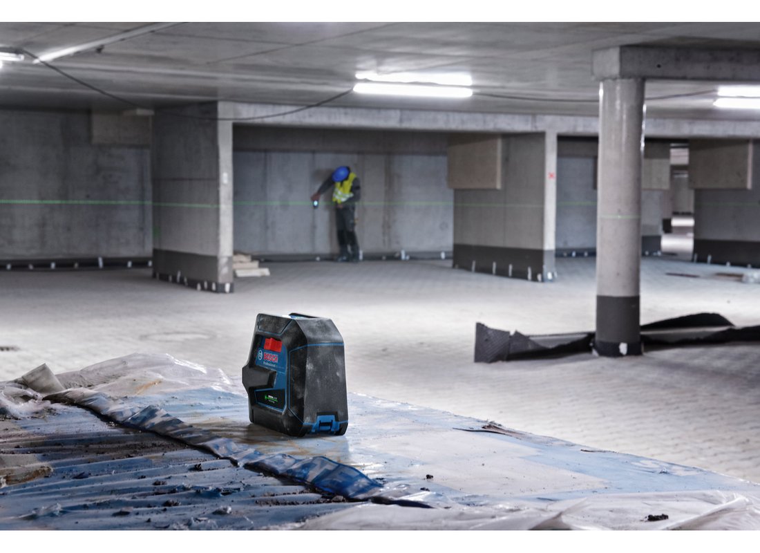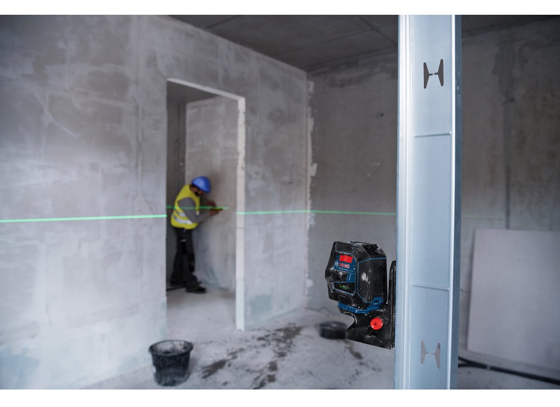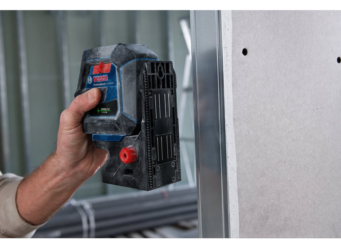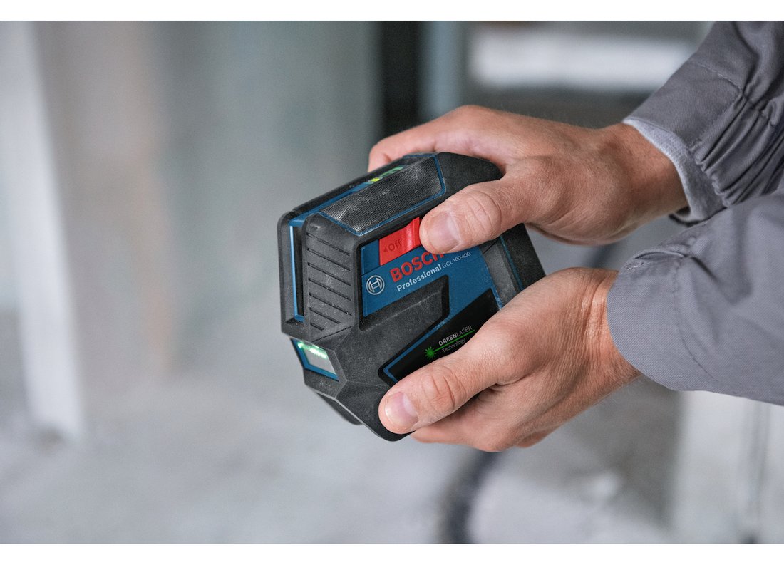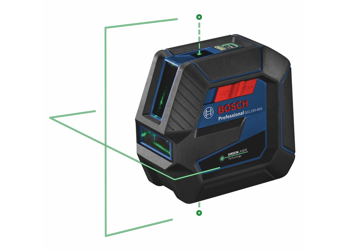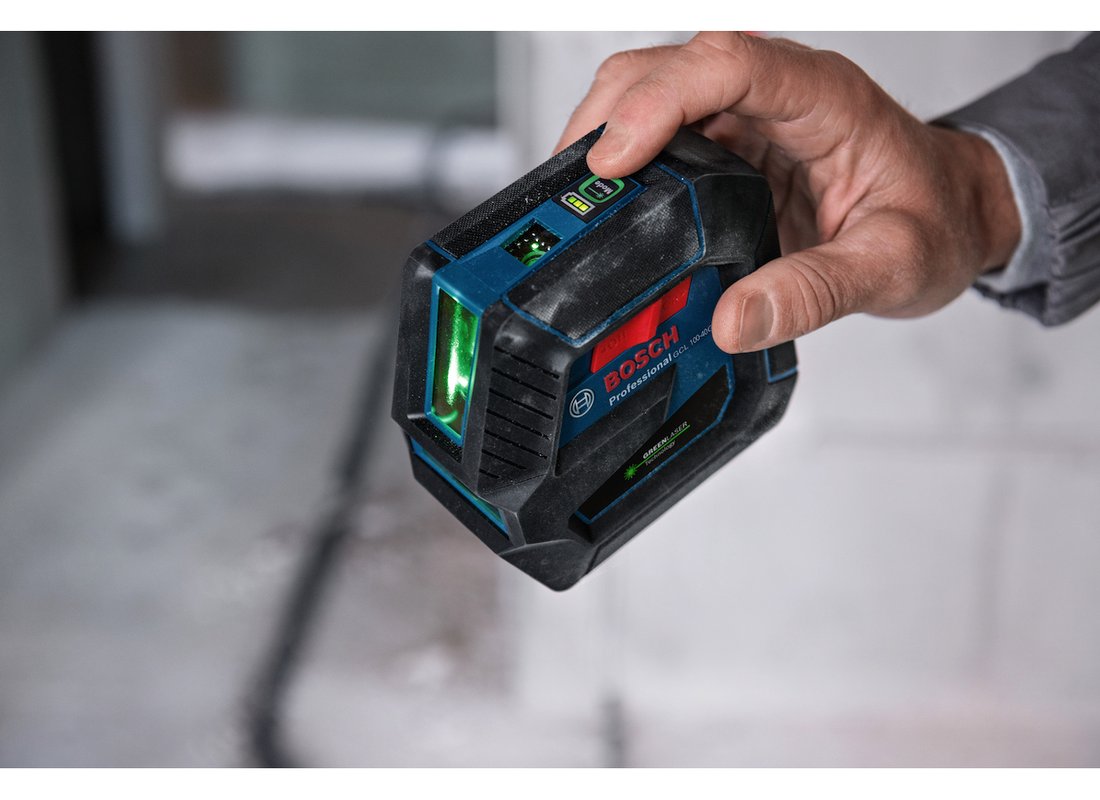 The Bosch GCL100-40G Green Beam Self-Leveling Cross-Line Laser with Plumb Points uses green-beam technology, which emits green lines and points up to 4X brighter than standard red beams. This gives the laser a working range for the lines of up to 165 Ft. The laser produces vertical, horizontal, cross-line modes, as well as upward and downward green plumb points. The tool can project two lines independently or together, for a broad array of alignment and leveling applications. It includes Bosch-exclusive VisiMax™ technology, which monitors tool temperature and power consumption to deliver the brightest line for the job. The tool has full rubber overmold housing, designed to be similar to a roll cage, so every major impact point is reinforced with rubber. It is an IP64 rating, and features deeply recessed windows help protect the laser glass. The onboard user interface allows easy selection among the layout modes. The Bosch Smart Pendulum System self-levels and indicates out-of-level condition, and it locks the pendulum for secure transport. The included RM10 Rotating Mount offers quick setup, extra-strong magnets, and fine adjustment rotating nob.