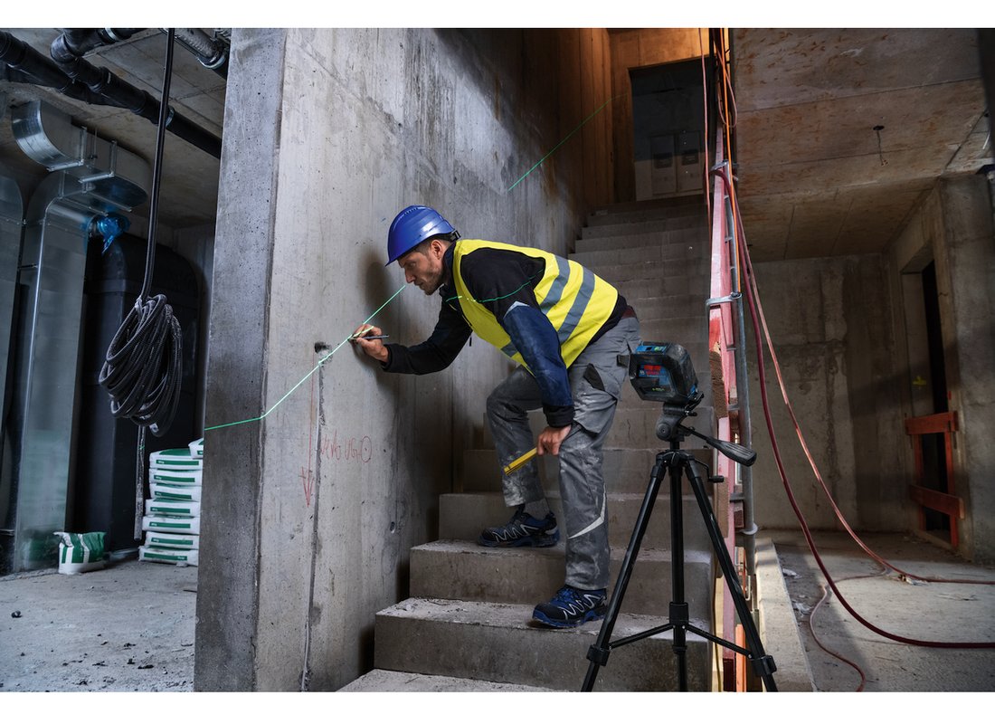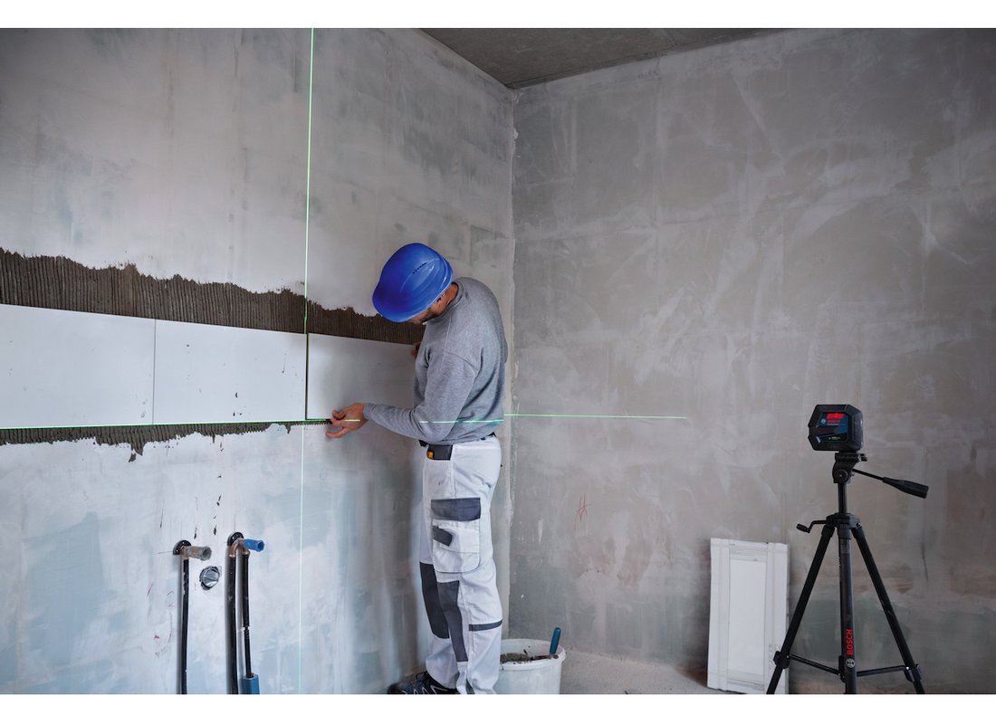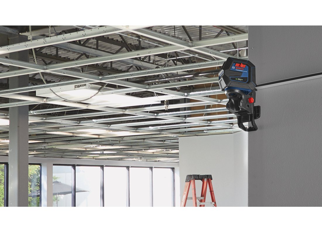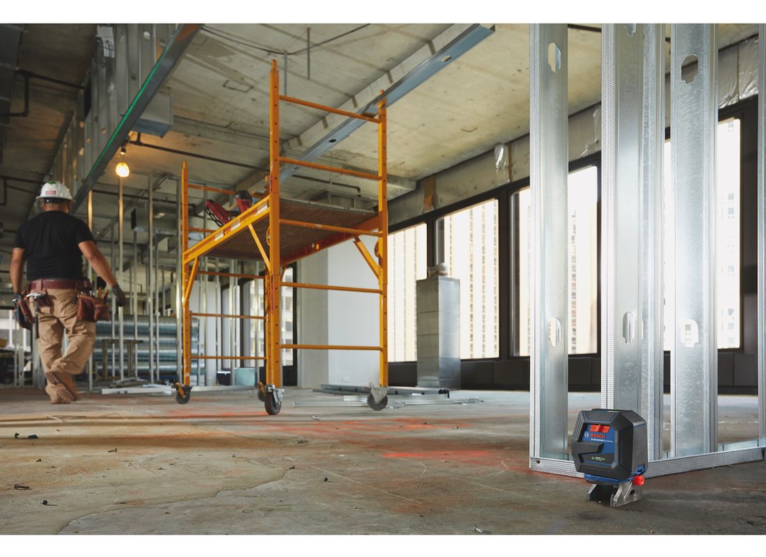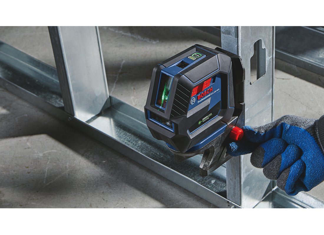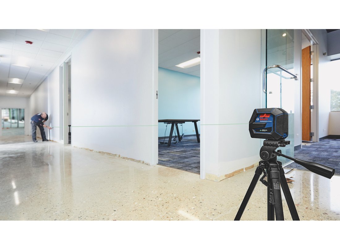 The Bosch GCL100-40G Green Beam Self-Leveling Cross-Line Laser with Plumb Points uses green-beam technology, which emits green lines and points up to 4X brighter than standard red beams. This gives the laser a working range for the lines of up to 165 Ft. The laser produces vertical, horizontal, cross-line modes, as well as upward and downward green plumb points. The tool can project two lines independently or together, for a broad array of alignment and leveling applications. It includes Bosch-exclusive VisiMax™ technology, which monitors tool temperature and power consumption to deliver the brightest line for the job. The tool has full rubber overmold housing, designed to be similar to a roll cage, so every major impact point is reinforced with rubber. It is an IP64 rating, and features deeply recessed windows help protect the laser glass. The onboard user interface allows easy selection among the layout modes. The Bosch Smart Pendulum System self-levels and indicates out-of-level condition, and it locks the pendulum for secure transport. The included RM10 Rotating Mount offers quick setup, extra-strong magnets, and fine adjustment rotating nob.
