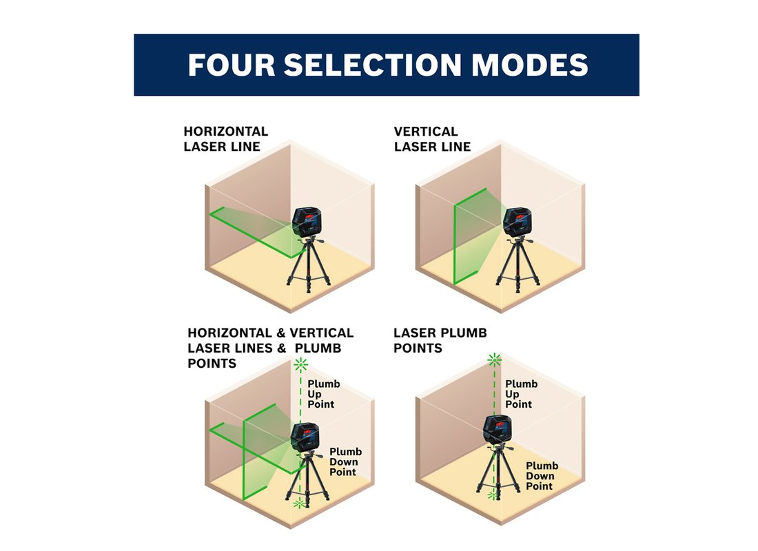• Easy-to-use laser setup modes – controls vertical, horizontal, cross lines, and plumb points
