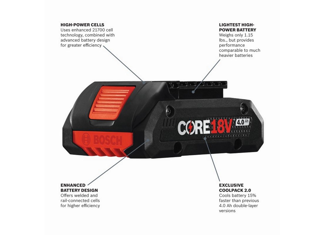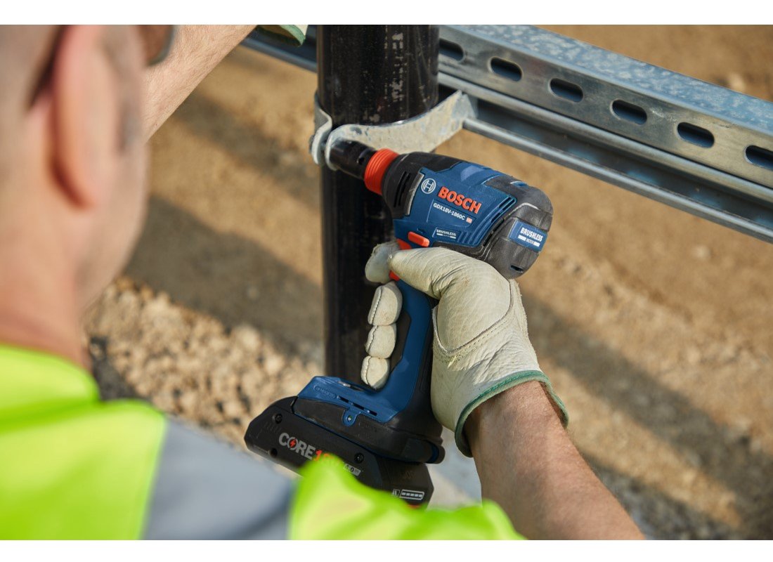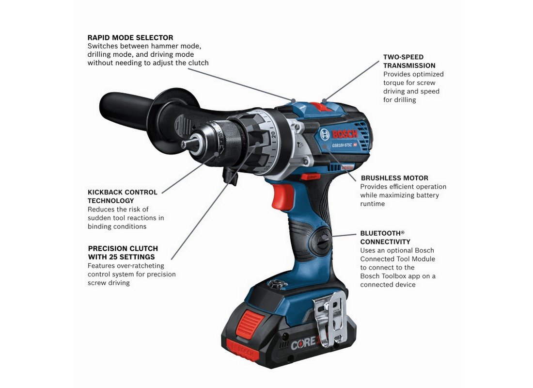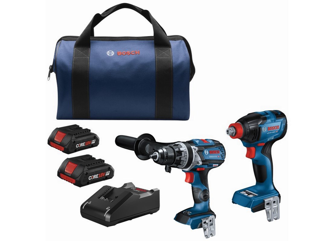 - The Bosch Brushless 2-Tool Combo Kit with two CORE18V® batteries deliver professional cordless drilling and driving performance. The GDX18V-1860C two-in-one impact driver/wrench goes from impact wrench to impact driver fast. It features a 1/4 In. quick-change hex shank with power groove for bits, and a 1/2 In. square drive for sockets. Preset modes, such as Auto Stop which helps prevent overdriving, can be fine-tuned to the job at hand via the Bosch Toolbox App (connectivity module included). In reverse, with bolt mode activated, the Auto Bolt Release helps prevent accidentally dropping bolts and nuts during removal. The GSB18V-975C 1/2 In. Hammer Drill/Driver powers up to 975 In.-Lbs. of max torque and 0-31,500 beats per minute (bpm), but weighs only 3.4 Lbs. (tool only, not including battery). It has variable speed settings and a precision clutch with 25 settings. It has KickBack Control to reduce the risk of injury from sudden rotational torque reaction. The kit includes two CORE18V® Compact 4.0 Ah batteries, which each deliver 2x the runtime compared to previous generation BAT612 2.0 Ah battery. l