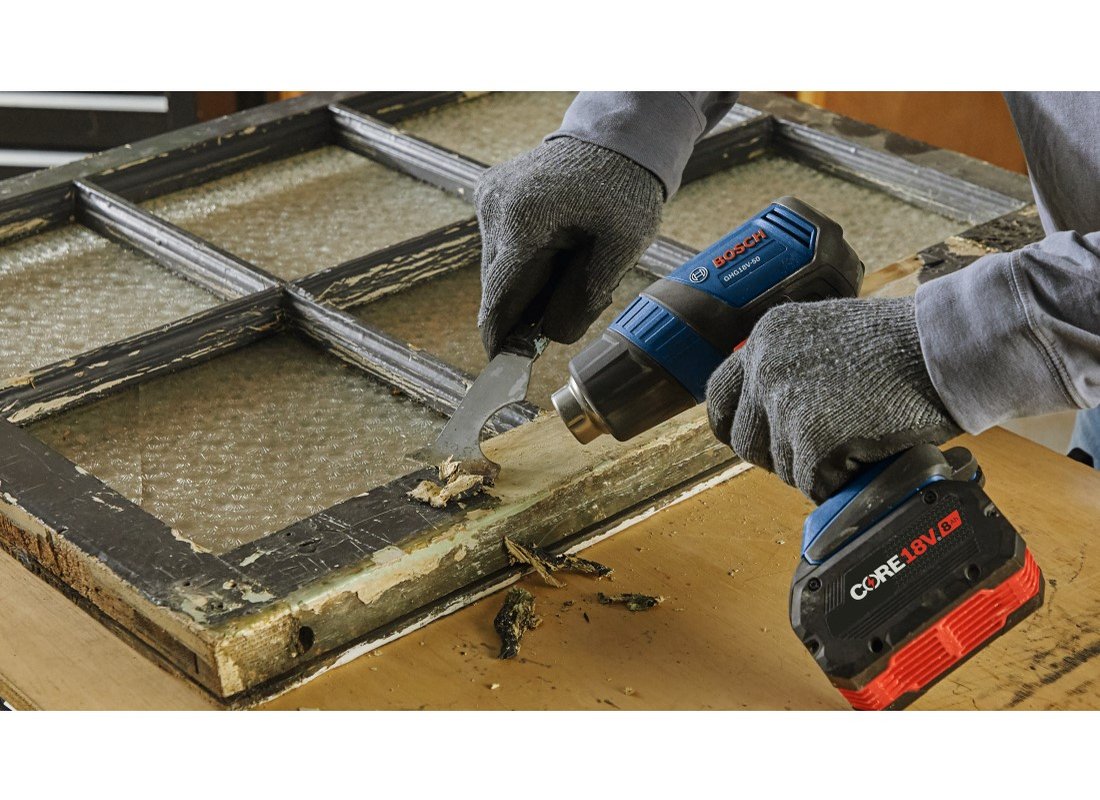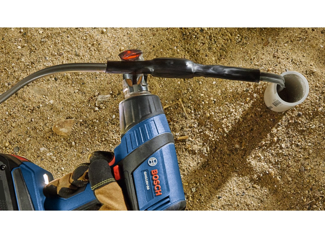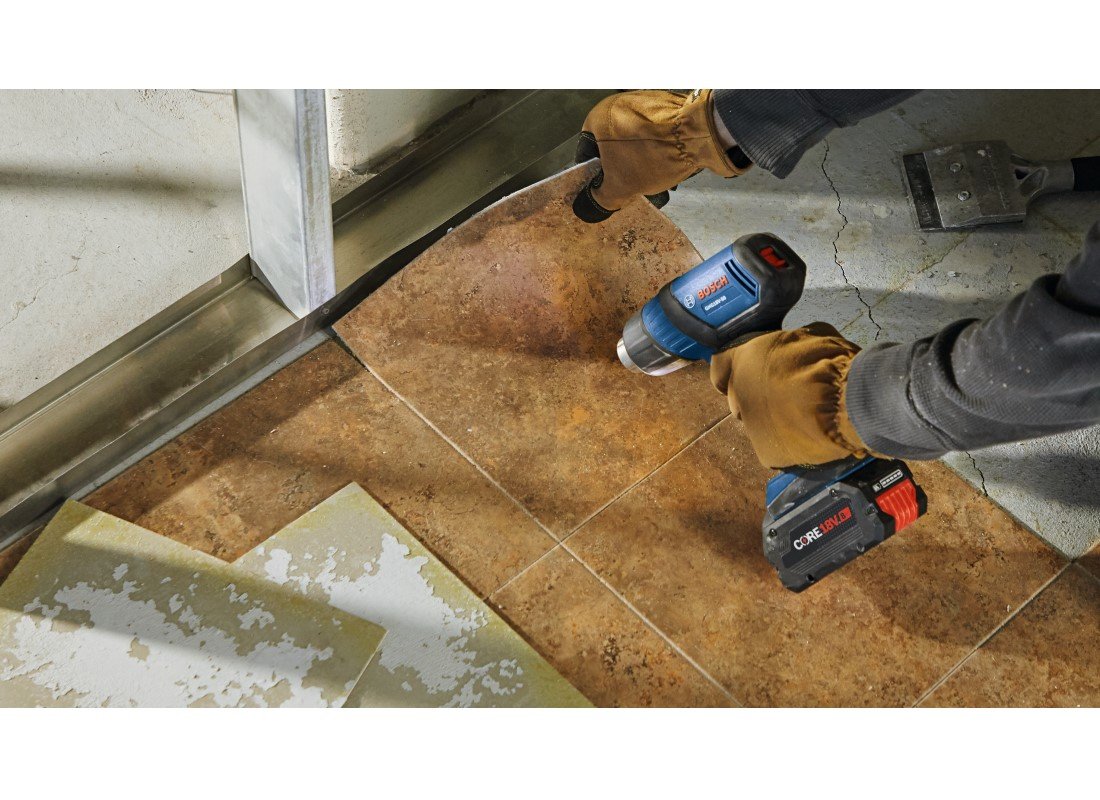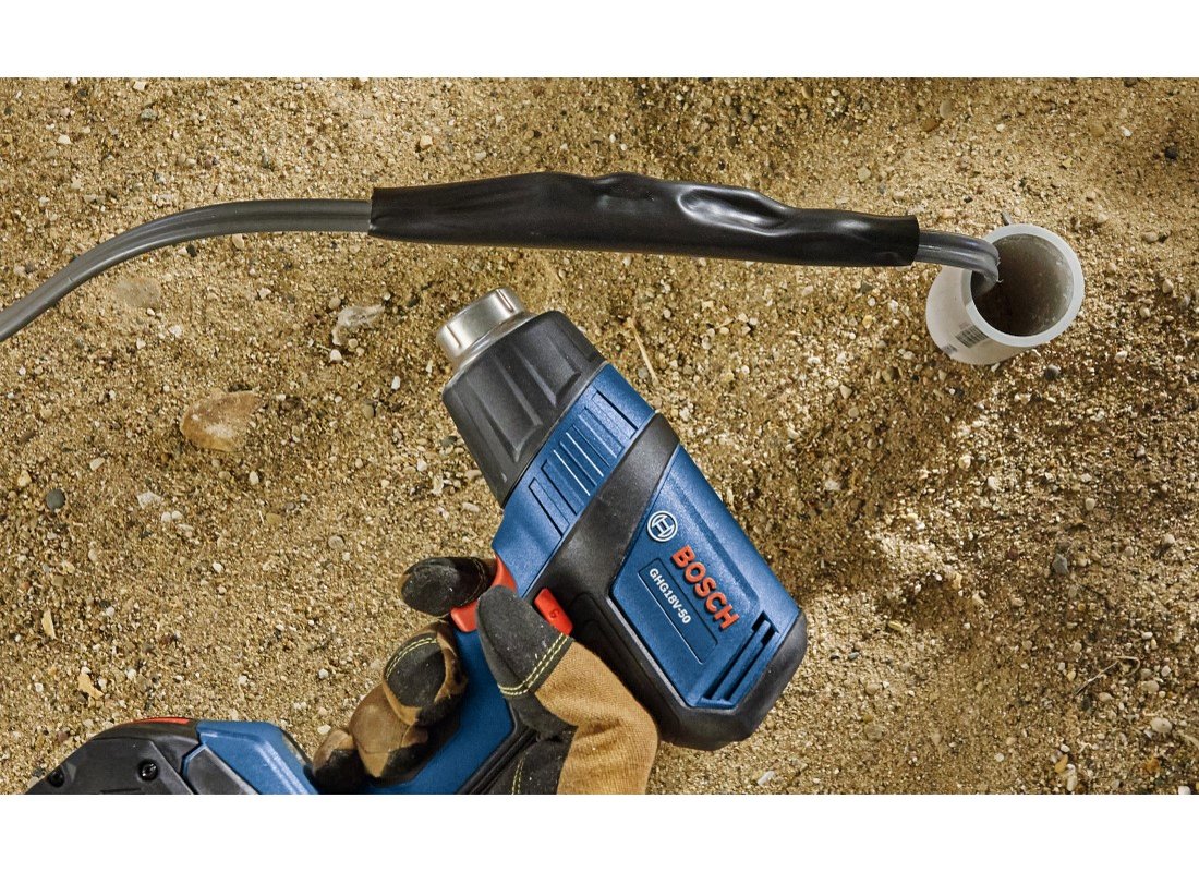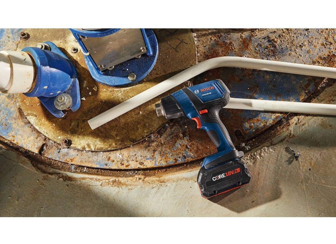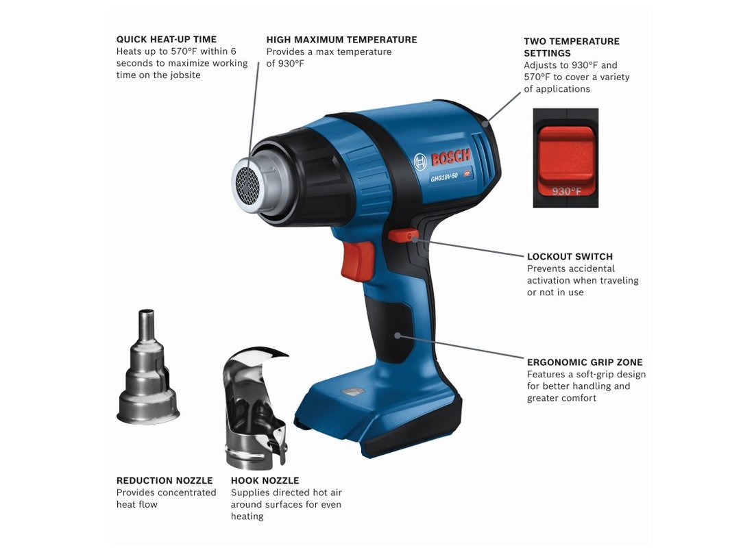 The Bosch GHG18V-50 18V Heat Gun delivers fast heat-up time, heating up to 570°F within six seconds to maximize working time on the jobsite. It features a reduction nozzle, which provides concentrated heat flow. It also has a hook nozzle, which supplies directed hot air around surfaces for even heating. It has two temperature settings – 930°F and 570°F – to cover a variety of applications. When paired with the CORE18V® 8.0 Ah battery it provides a runtime of up to 21 minutes at 570°F. It provides a max airflow rate of 175 liters per minute for efficient heating. The heat gun features an LED worklight, a lockout switch to prevent accidental activation and an ergonomic grip zone. This heat gun is ideal for electricians, automotive technicians and others for heat-shrinking wires, removing labels, softening adhesives, bending plastic pipes and more.