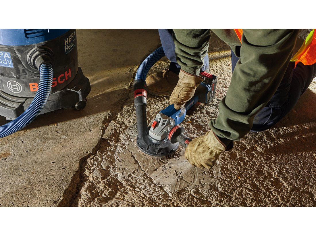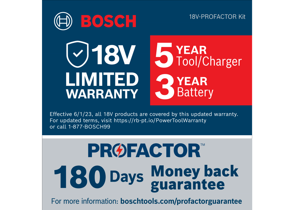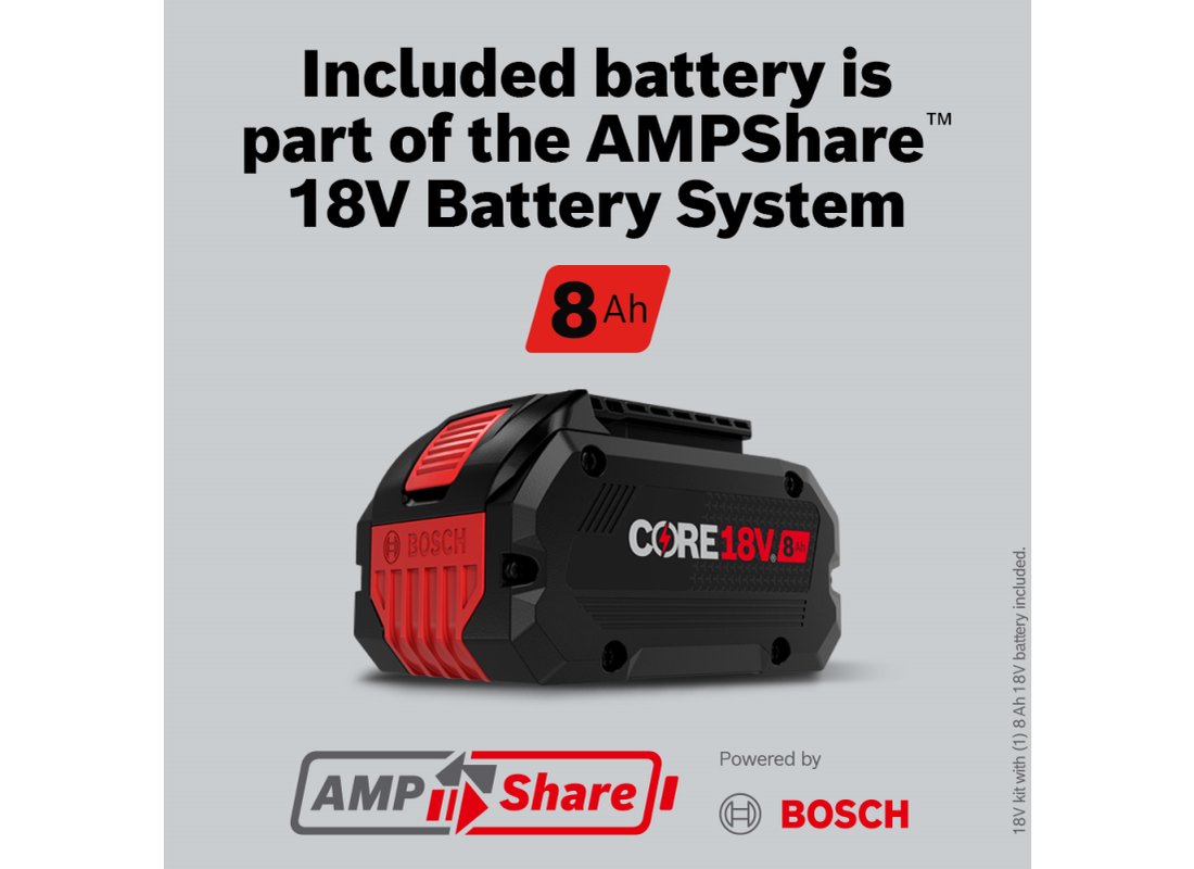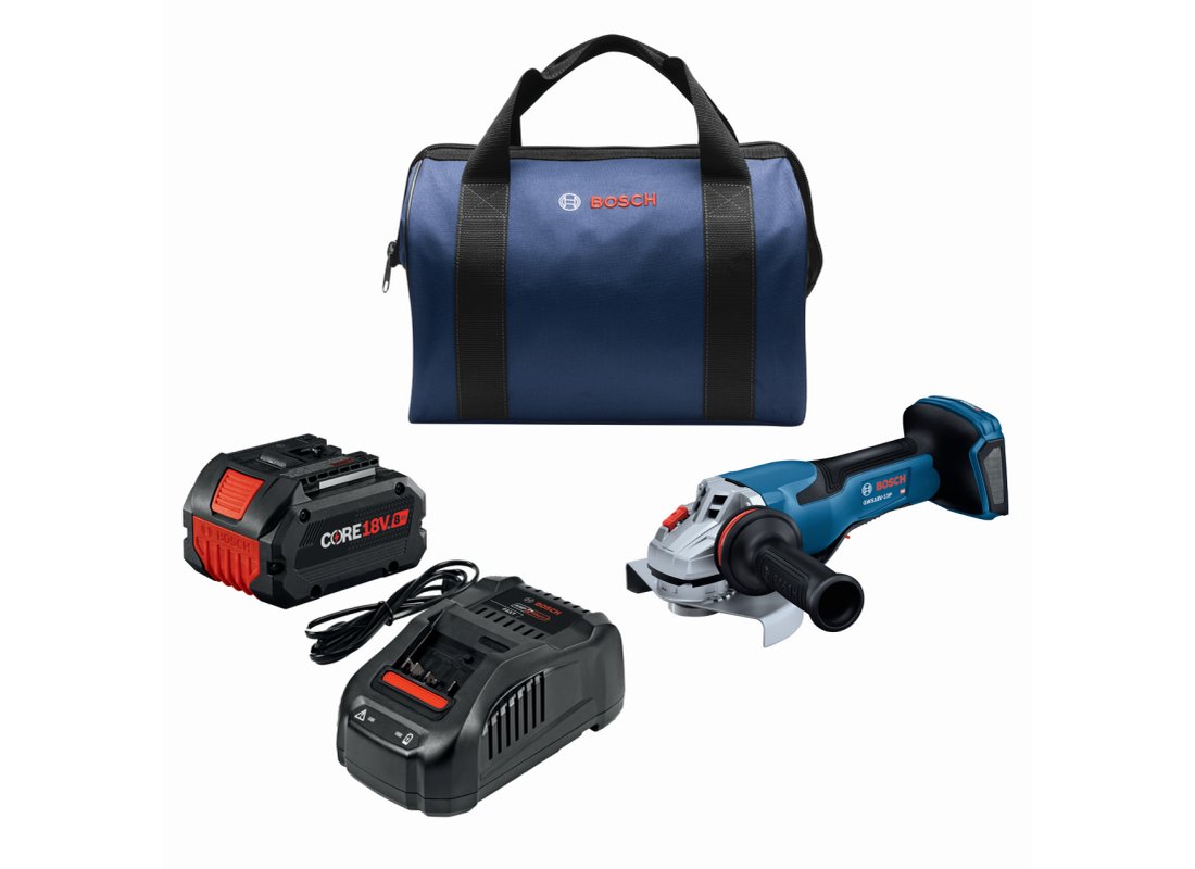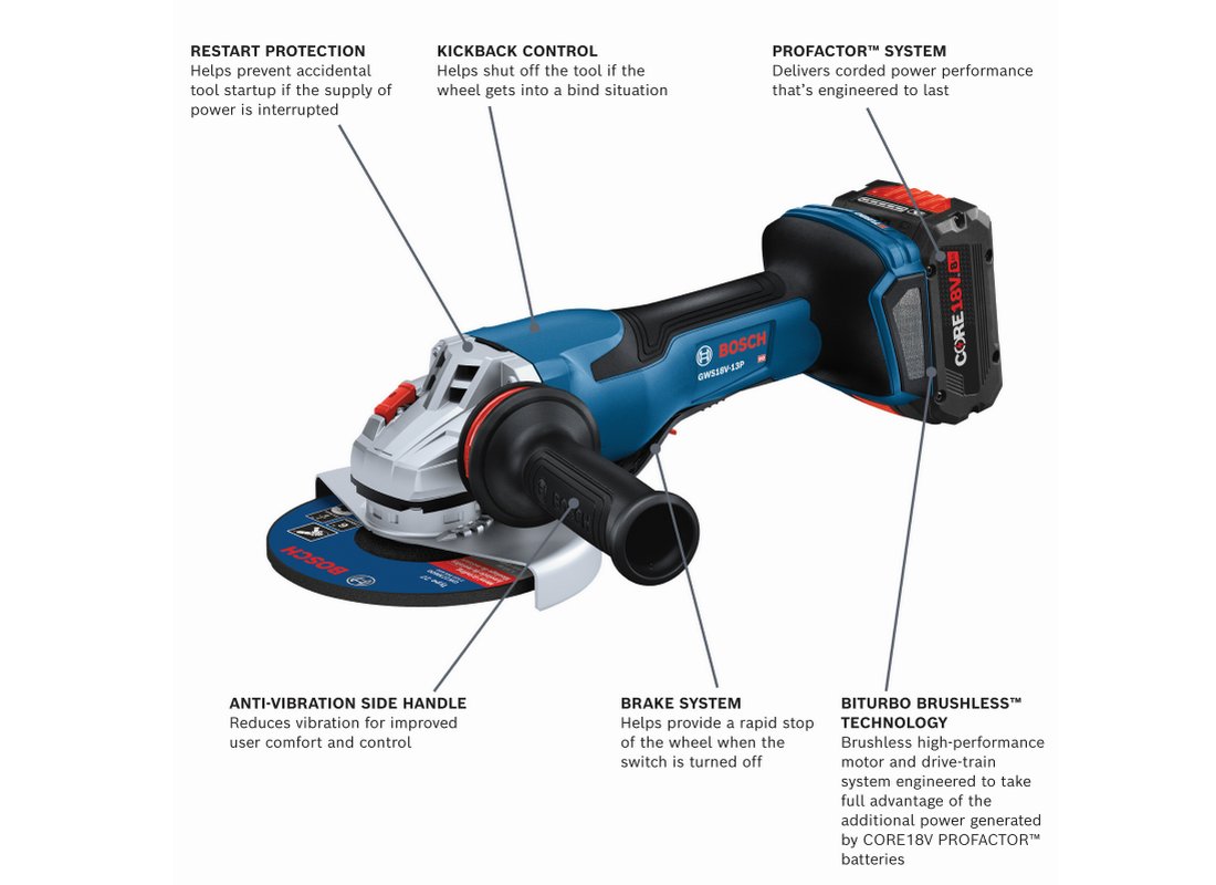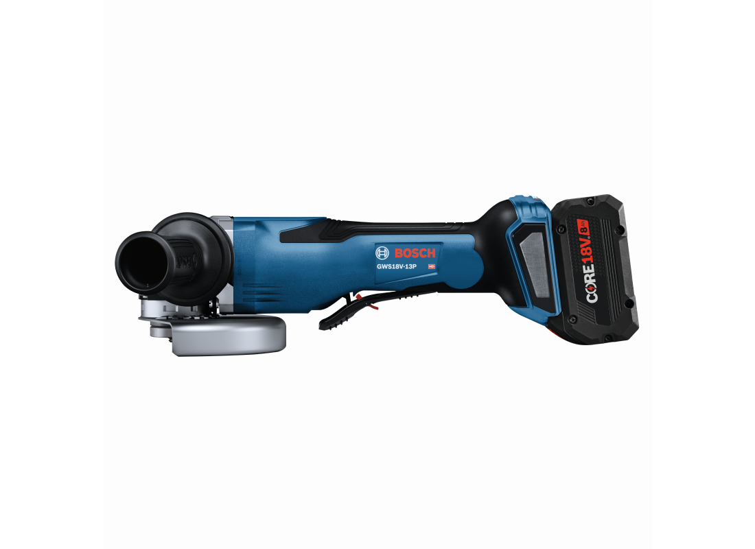 The Bosch GWS18V-13P 18V 5 – 6 In. Angle Grinder with Slide Switch delivers the ultimate combination of performance, control and power in a cordless grinder. This tool is part of the PROFACTOR™ System, which pairs BITURBO Brushless™ Technology with a CORE18V® High Power Battery. BITURBO Brushless™ Technology is a high-performance motor and drive-train system designed to deliver power comparable to high-demand corded tools. The grinder includes KickBack Control, which helps shut off the tool if the wheel gets into a bind situation. It also has restart protection to help prevent accidental tool startup if the supply of power is interrupted. It also includes advanced electronics such as constant electronics and overload protection. The grinder includes a brake system, which helps provide a rapid stop of the wheel when the switch is turned off, and a multi-grip paddle switch, which provides increased grip options for better comfort and control. It features spiral bevel gears for smooth transmission of power, a two-position Vibration Control side handle, adjustable tool-free guard and slim soft-grip design for additional grip ergonomics. The kit includes a CORE18V® 8 Ah High Power Battery, which delivers 50% more runtime and over 75% more power than the CORE18V® 4 Ah battery, powering high-demand applications.