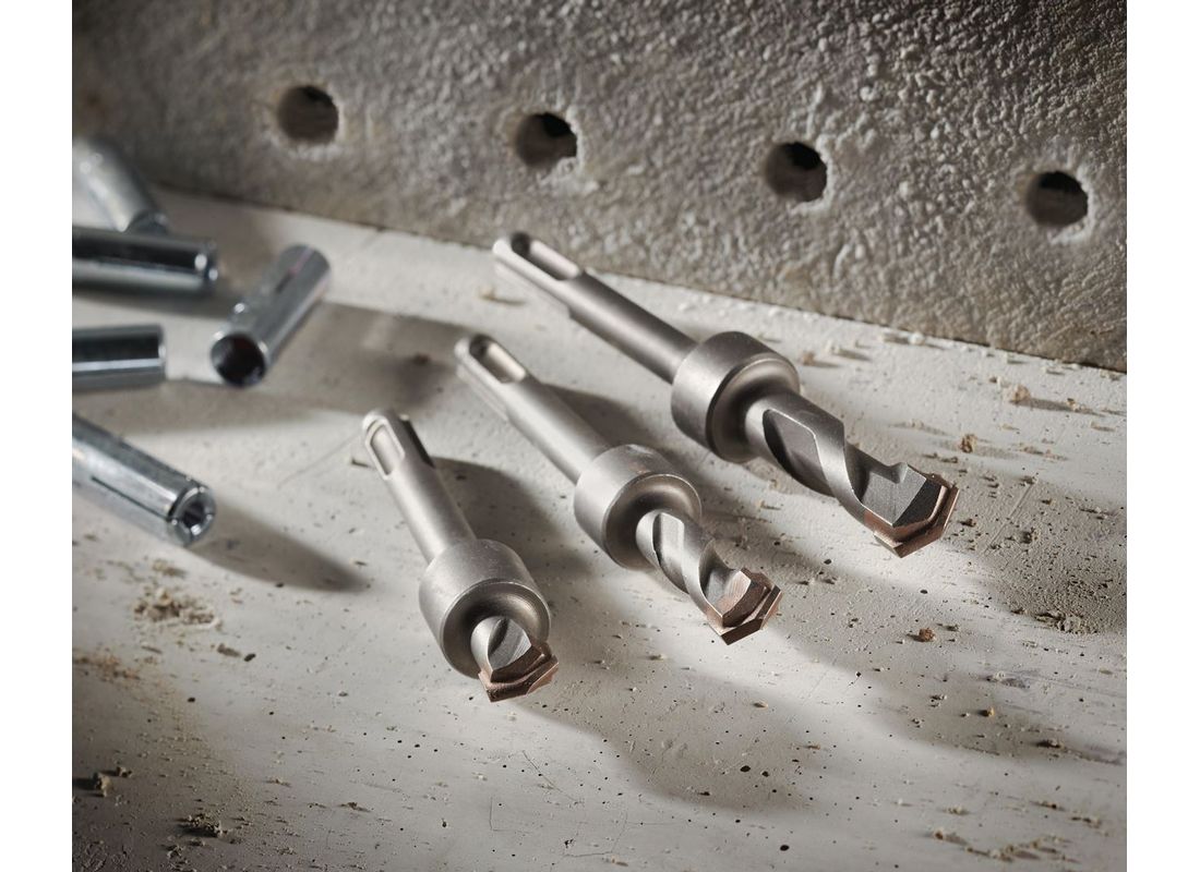 Key masonry applications, ranging from suspension of struts for electrical and air systems to hardware for overhead piping and sprinkler systems, Bosch stop bits bring precision, speed and professionalism to a task once marked by guess work and drill bits marked with tape. Applications are designed to incorporate drop-in anchors. A steel collar on each bit marks the precise depth of the hole. Once the collar is flush with the concrete surface, the correct depth is reached.