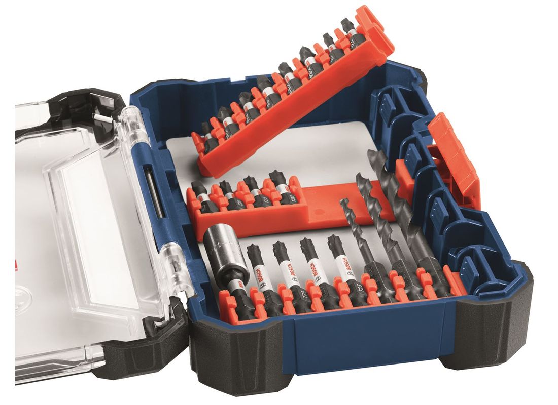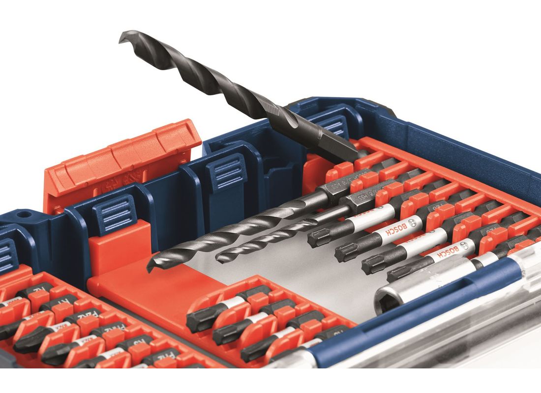 Le coffret sur mesure Bosch est conçu pour les attaches d’embouts de vissage doubles Impact Tough™ et constitue le meilleur boîtier pour les meilleurs embouts. Les embouts Impact Tough™ ont été améliorés pour fournir une durée de vie 10 fois supérieure à celle des embouts pour percussion standard. Grâce à leurs deux pointes, les embouts de vissage doubles apportent de la valeur ajoutée et bénéficient d’une durée de vie plus longue, tout en conservant les performances des embouts de vissage simples grâce à sa zone de torsion étendue. Cette zone absorbe les pics de couple pour réduire la tension au niveau des têtes d’embouts. Cette fonctionnalité est essentielle pour les visseuses à chocs de couple élevé modernes. Les attaches sont facilement insérables et retirables du boîtier pour simplifier l’accès et le transport des embouts vraiment nécessaires. Dans les clips sont logés quatre embouts de vissage doubles pouvant être retirés et remis en place facilement en les inclinant. Ce système de rangement personnalisable intègre un coffret résistant et de conception ingénieuse permettant d’améliorer la productivité des utilisateurs en réduisant le temps passé à la recherche de l’embout adapté.