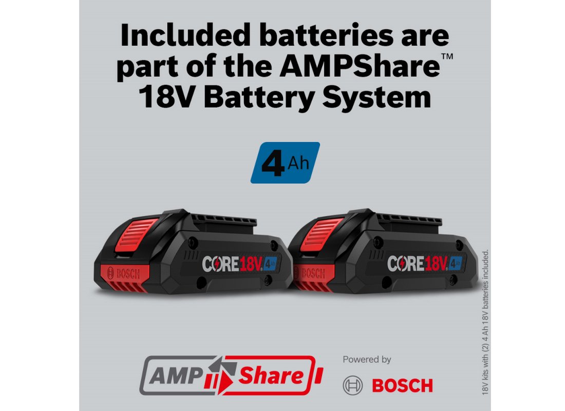 - Compatibilité AMPShare™ : les batteries et chargeurs 18V sont compatibles avec les outils sans fil 18V Bosch et une liste croissante de produits sans fil des marques AMPShare™ partenaires