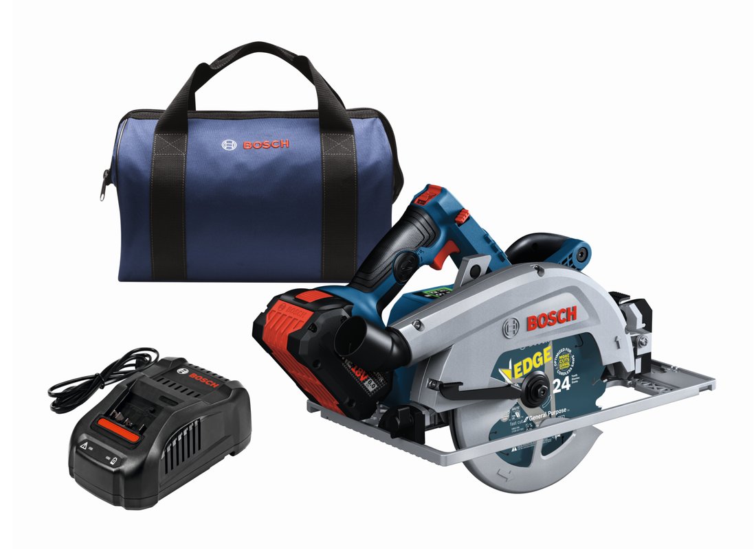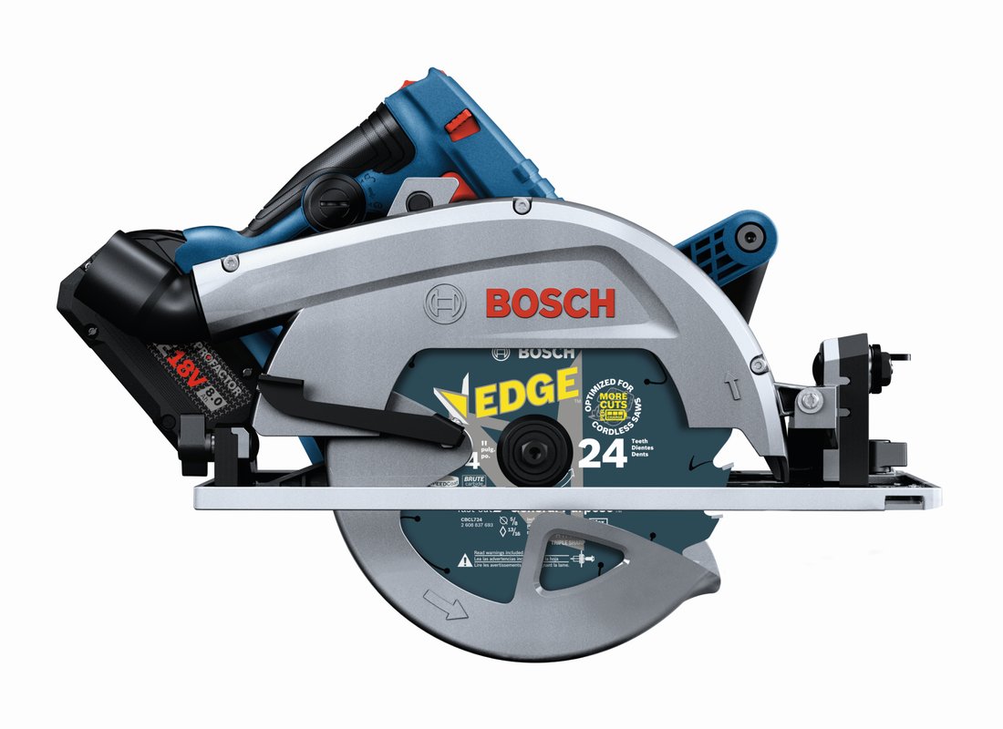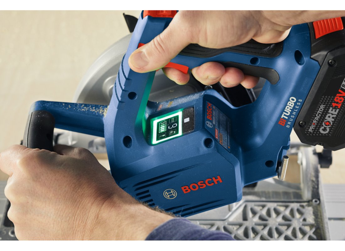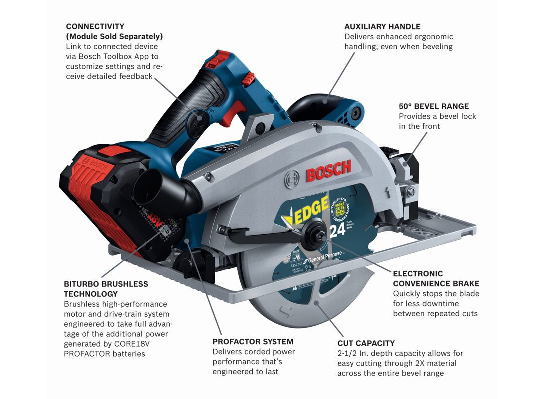 Cette scie circulaire Strong Arm sans fil 18 V de 7-1/4 po offre des performances équivalentes à celles de modèles filaires. La scie circulaire 18 V BITURBO Brushless de 7-1/4 po GKS18V-25GC Bosch à capacité de coupe de 2-1/2 po permet d’effectuer facilement des coupes dans des matériaux de 2 po d’épaisseur sur l’ensemble de la plage de coupes biaises. Cette scie circulaire fait partie du système PROFACTOR associant la technologie BITURBO Brushless et une batterie PROFACTOR CORE18V. La technologie BITURBO Brushless allie un moteur et un système de transmission hautement performants permettant de disposer d’une puissance comparable à celle des outils filaires pour applications exigeantes. Son mode ECO prolonge jusqu’à 30 % l’autonomie de la batterie pour les travaux longs. Le système de réglage de profondeur à bouton unique permet de modifier la profondeur de coupe rapidement et avec précision d’une seule main. L’interface utilisateur (écran de contrôle) intégrée permet de régler six vitesses différentes et d’être renseigné sur l’état de l’outil. Après insertion d’un module de connectivité (vendu séparément), la scie peut être connectée à l’application Bosch Toolbox sur un appareil mobile pour personnaliser les réglages et obtenir des informations d’état détaillées. Elle est inclinable pour effectuer des coupes biaises de 0 à 50° et dispose d’une poignée supplémentaire améliorant la stabilité et la prise en main. Pour effectuer des coupes droites rapides, elle peut être montée sur les systèmes de rail de guidage Bosch et elle est également compatible avec certains systèmes de guidage d’autres marques. Elle est dotée d’un frein électronique très pratique assurant une immobilisation très rapide de la lame et d’un raccord d’éjection orientable sur 360° permettant d’éloigner la poussière de bois de l’utilisateur quelle que soit la main avec laquelle elle est tenue.