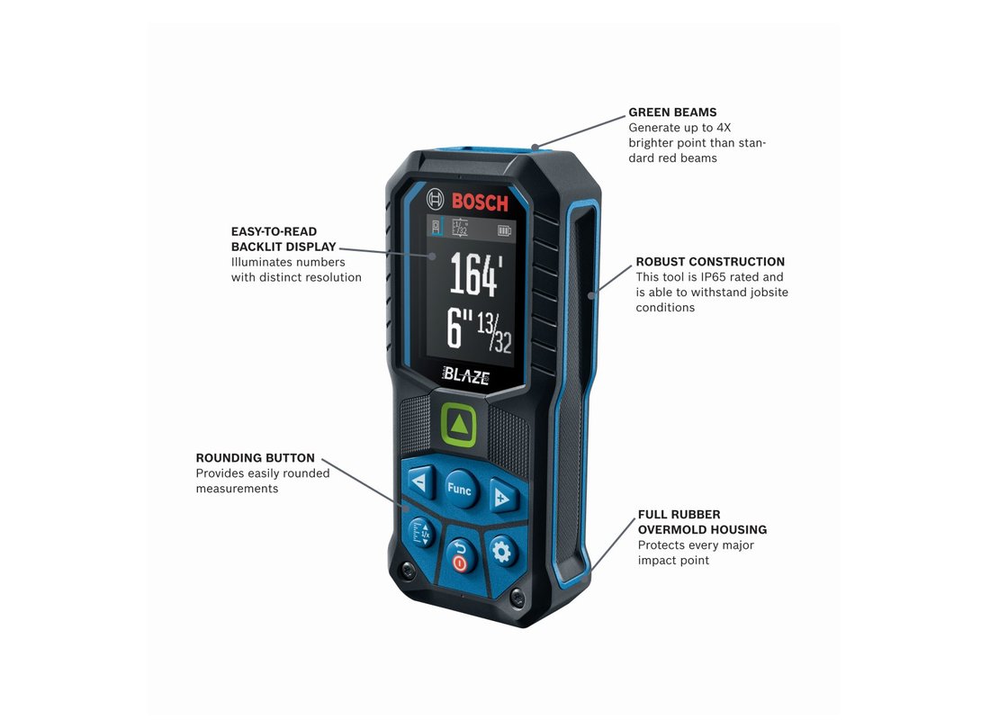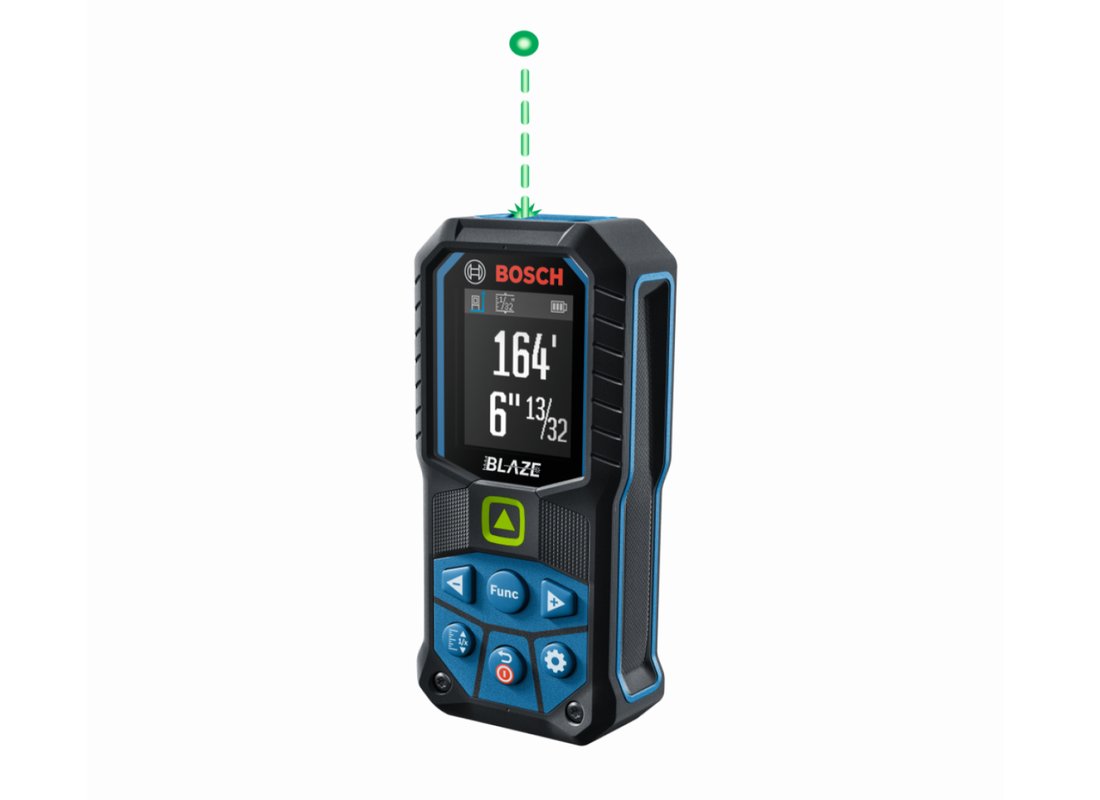 Ce télémètre laser de 165 pi à laser vert est un outil complet avec écran couleur facile à lire, grande précision et boîtier renforcé pour une grande longévité. Le GLM165-25G BLAZE™ Bosch bénéficie de la technologie laser verte permettant de générer des points jusqu’à 4 fois plus lumineux que les faisceaux rouges standard. Doté d’une précision jusqu’à ±1/16 po, le laser inclut un bouton permettant d’arrondir les résultats de mesure à la fraction la mieux adaptée à l’application ainsi qu’un retour tactile pour les chantiers bruyants. Le télémètre laser offre aussi une protection IP65 et possède un design ergonomique assurant une prise en main parfaite. Au total 11 fonctions de mesure sont incluses, dont mesure de distances en temps réel, mesure de distances/surfaces/volumes et mesures indirectes, fonction addition/soustraction.