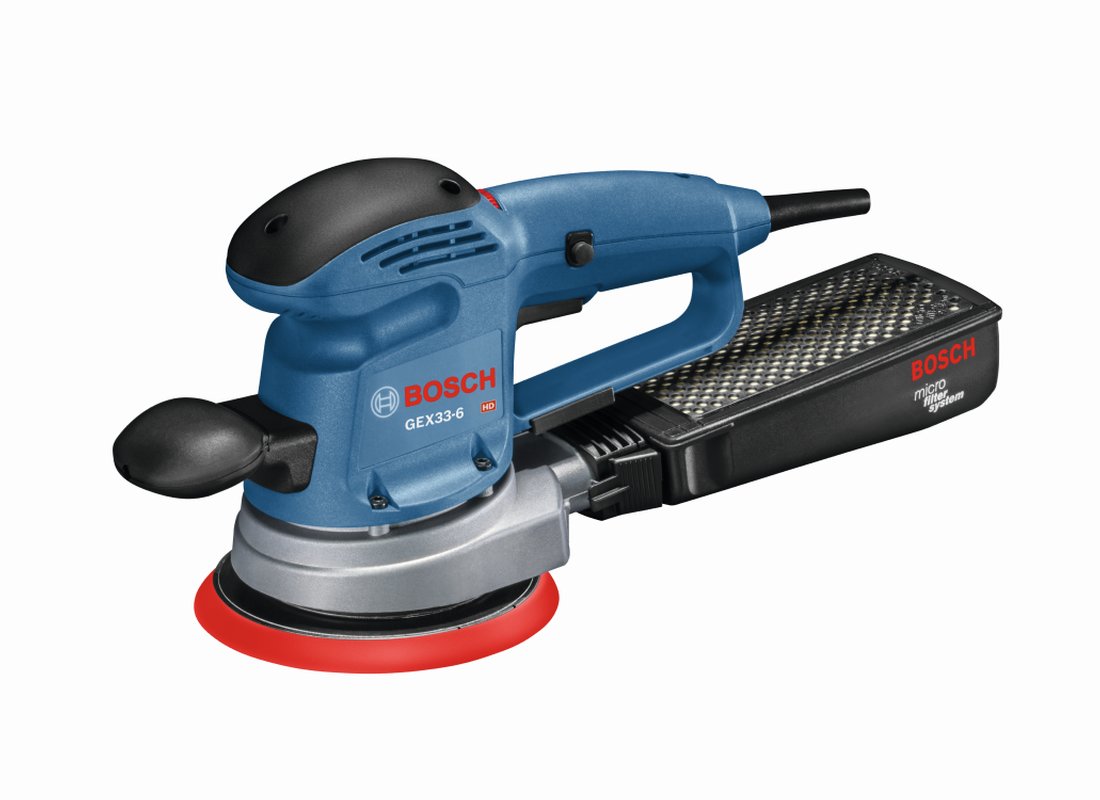 La ponceuse/polisseuse excentrique à multiperforation de 6 po GEX33-6N Bosch accepte quasiment toutes les marques de papier abrasif du marché grâce à son plateau à multiperforation. La ponceuse permet d’obtenir une très bonne qualité de surface grâce à une aspiration optimale de la poussière. L’aspiration améliorée de la poussière due à la multiperforation a aussi pour effet de multiplier par 2 la durée de vie du papier abrasif. Son système d’élimination de poussière à microfiltre filtre les poussières fines jusqu’à 1/2 micron de diamètre. L’outil est doté d’un carter d’engrenages robuste en aluminium moulé sous pression et d’un plateau supporté par deux roulements pour réduire les vibrations. La molette de présélection de vitesse permet de faire varier la vitesse de la ponceuse entre 4 500 et 12 000 osc/min pour une adaptation parfaite au matériau et au type d’application. Afin de garantir un maintien ferme sur le plateau lors de son utilisation, le disque dispose d’un système de fixation auto-agrippant. La ponceuse a été conçue avec une partie supérieure à prise souple et un corps ergonomiques.