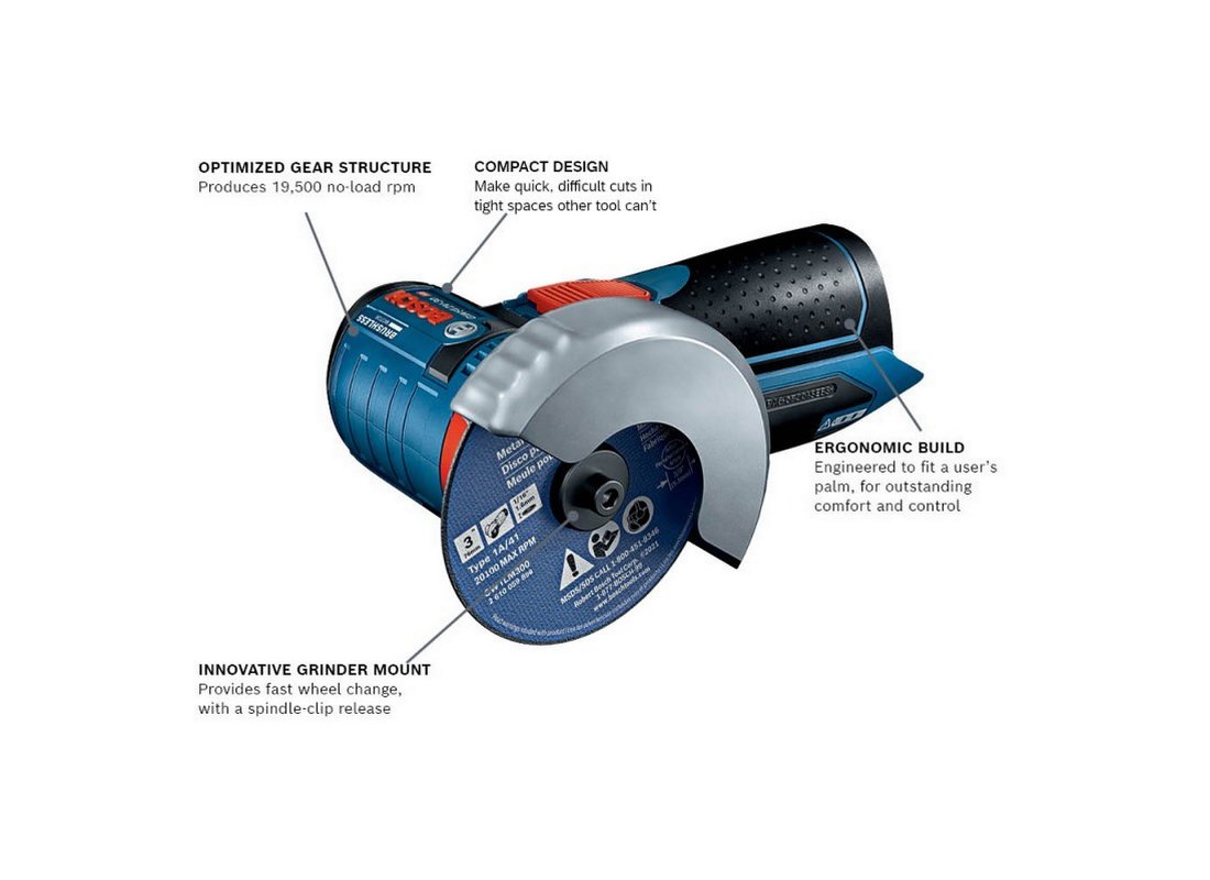 - DESCRIPTION DU PRODUIT La rectifieuse angulaire 12V Max de 3 po GWS12V-30 Bosch est idéale pour les professionnels qui ont besoin d’un concentré de puissance pour effectuer rapidement des coupes exigeantes dans des endroits difficiles d’accès, irréalisables avec d’autres outils. Dotée d’un moteur sans balais et d’un mécanisme d’engrenage optimisé, cette rectifieuse performante offre un bon rapport poids/performance avec un régime à vide de 19 500 tr/min et un poids de seulement 1,5 lb (outil seul, sans batterie). Particulièrement ergonomique, la rectifieuse est conçue pour tenir dans la paume de la main pour une maîtrise et une maniabilité parfaites. Très polyvalente, elle est suffisamment puissante pour tronçonner des tiges filetées, des traverses, des tubes, du carrelage et bien plus encore. Elle est dotée d’un mécanique de blocage de broche innovant garantissant un changement de disque rapide ; il suffit de tirer le clip de blocage et de dévisser la vis de broche. La rectifieuse dispose d’une protection anti-redémarrage évitant tout redémarrage accidentel et d’une protection contre les surcharges réduisant les risques de surchauffe et de surcharge du moteur. Elle se distingue par ailleurs par un temps de freinage très court : le disque s’immobilise aussitôt après avoir arrêté la rectifieuse.