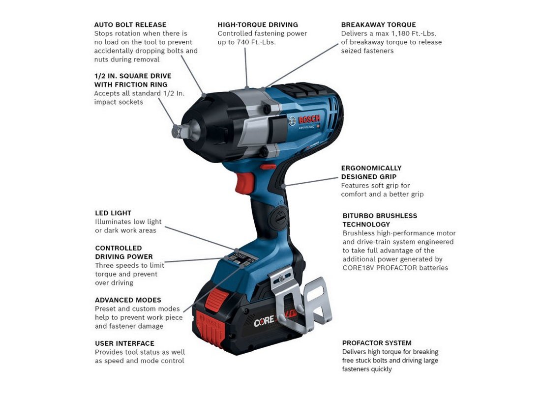 - Technologie PROFACTOR™ : permet de disposer d’un couple élevé pour décoller les boulons grippés et visser rapidement de grands écrous, boulons et vis