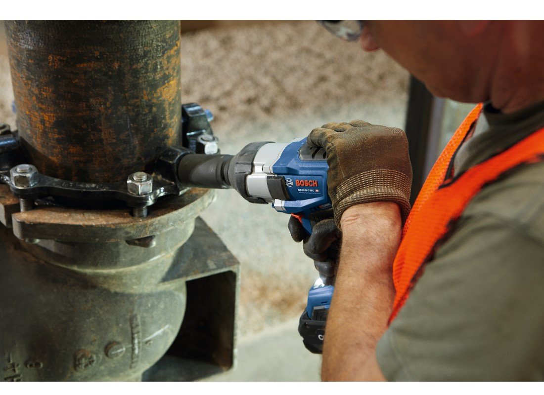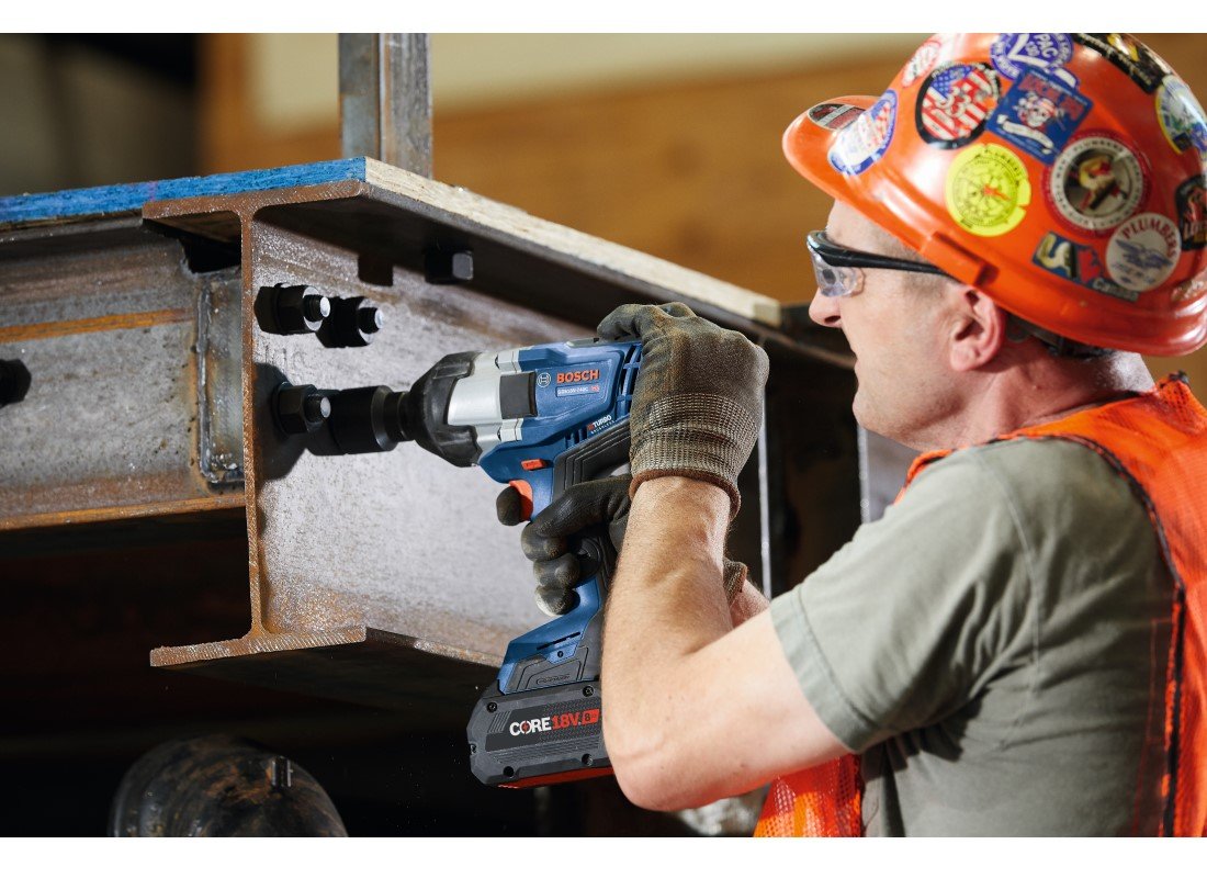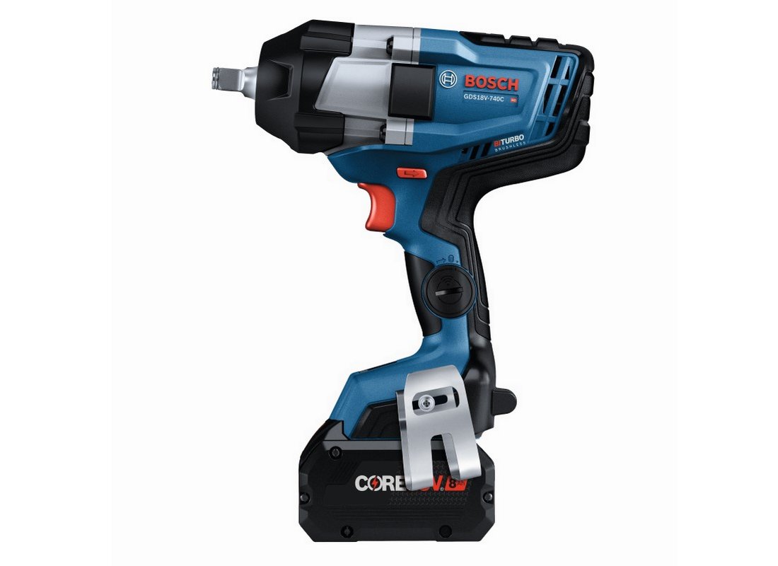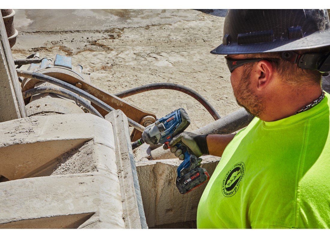 La clé à chocs 18V connectée PROFACTOR™ de 1/2 po GDS18V-740C Bosch avec bague de friction est conçue pour dévisser et visser rapidement de gros boulons, écrous et ancrages. Fait partie du système PROFACTOR™ associant la technologie BITURBO Brushless™ et une batterie High Power CORE18V®. La technologie BITURBO Brushless™ combine un moteur haute performance et un système de transmission conçu pour fournir une puissance comparable à celle des outils filaires à forte demande. Elle permet de visser avec un couple de serrage jusqu’à 740 pi-lb et de dévisser avec un couple de décollement de 1 180 pi-lb tout en offrant une grande autonomie. Cette clé à chocs dispose de trois combinaisons vitesse/couples préréglées et de modes spéciaux permettant d’éviter tout endommagement de la pièce et des boulons ou écrous. Les modes préréglés incluent des modes pour vis en métal et tirefonds. Des modes supplémentaires pour des matériaux et vis spécifiques peuvent être paramétrés et mémorisés via l’application Bosch PRO360 (le module de connectivité est inclus). Quand le mode boulon est activé, la fonction ABR (Auto Bolt Release) arrête la rotation dès que le couple devient nul afin d’éviter que les boulons tombent accidentellement pendant leur retrait. En plus de pouvoir paramétrer et personnaliser des modes et réglages, la fonction connectivité (module de connectivité est inclus) permet d’obtenir des informations spécifiques sur l’outil et son état de fonctionnement. La gâchette de vitesse permet de doser parfaitement la vitesse. Un éclairage DEL assure une bonne visibilité dans les endroits sombres. La clé à chocs possède au niveau de la tête un habillage en caoutchouc protégeant la pièce et l’outil contre les dommages. L’ensemble inclut une batterie High Power CORE18V® 8 Ah offrant 50 % d’autonomie en plus et 75 % de puissance en plus que la batterie CORE18V® 4 Ah pour les applications très exigeantes.