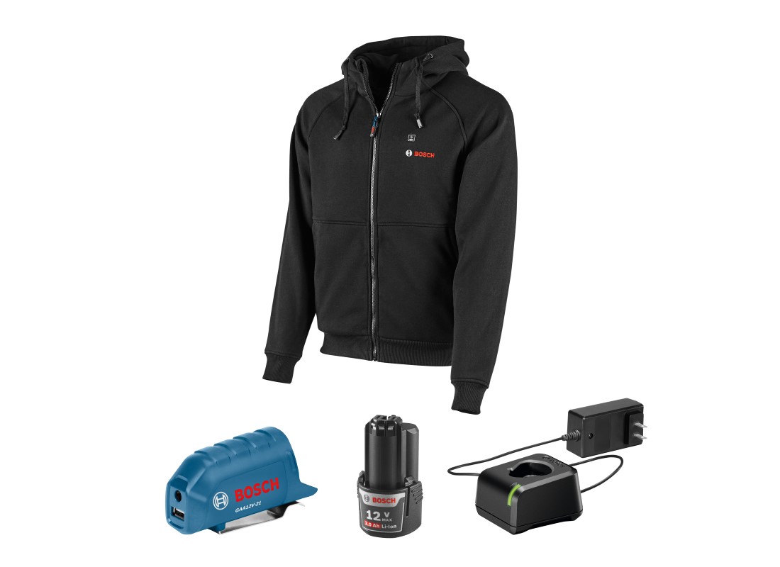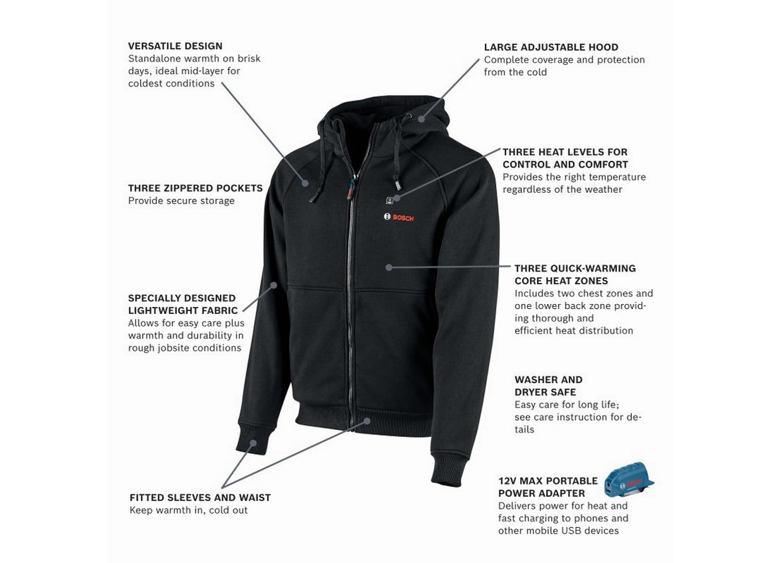 Très polyvalent, l’ensemble veste à capuche chauffante GHH12V-20 Bosch est constitué d’une matière souple légère et d’éléments chauffants placés à des endroits stratégiques. La veste à capuche dispose de trois zones chauffantes et utilise un tissu léger de conception spéciale alliant confort et durabilité. Deux des zones de chauffe sont situées au niveau de la poitrine et l’autre au bas du dos, à des endroits stratégiques assurant un réchauffement efficace du corps. La grande capuche ajustable assure une protection complète du haut du corps. Les trois températures réglables permettent un dosage parfait de la chaleur et un grand confort. Cet ensemble inclut l’adaptateur d’alimentation portatif 12 V Max Bosch GAA12V-21 permettant de tirer pleinement profit des avantages de leur batterie 12 V Max Bosch pour se réchauffer et pour alimenter des accessoires tels que appareils mobiles, téléphones et tablettes avec un courant de 2,1 A.