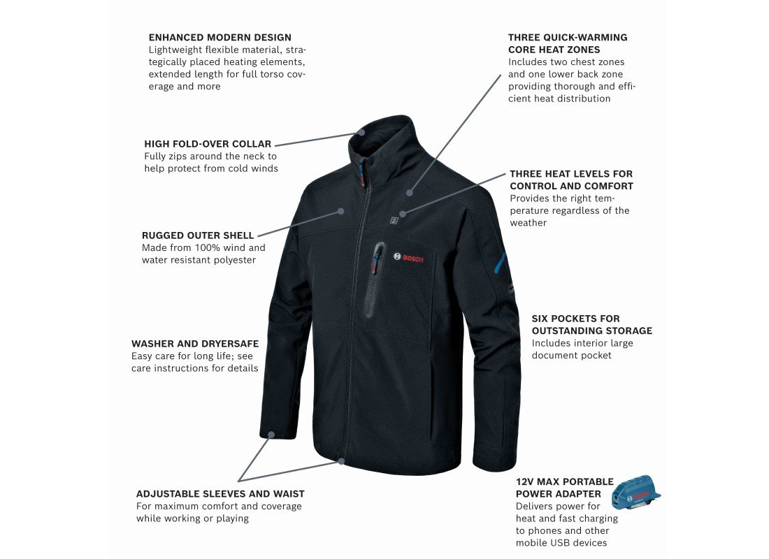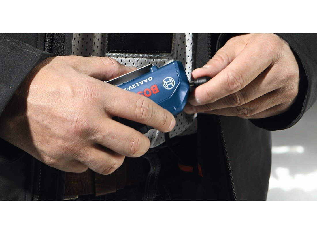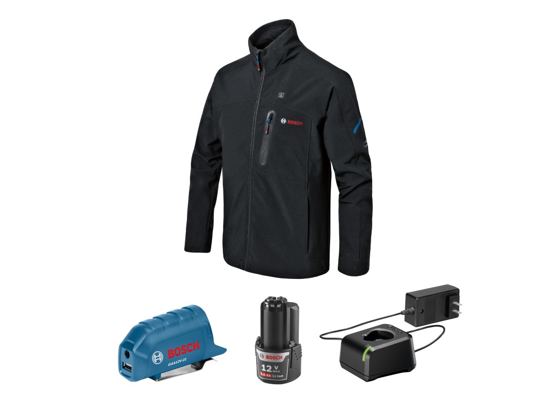 L’ensemble veste chauffante GHJ12V-20 Bosch inclut une veste à coupe moderne avec une matière plus légère et plus souple, des poches plus grandes et des éléments chauffants mieux placés que sur les vestes de la génération précédente. Avec cette veste chauffante, plus besoin de porter plusieurs couches de vêtements grâce aux trois zones de chauffe et à la matière extérieure très résistante, à la fois coupe-vent et imperméable. Deux des zones de chauffe sont situées au niveau de la poitrine et la troisième au bas du dos, à des endroits stratégiques assurant un réchauffement efficace du corps. Cet ensemble inclut l’adaptateur d’alimentation portatif 12 V Max Bosch GAA12V-21 permettant l’utilisation d’une batterie 12 V Max Bosch pour alimenter avec un courant de 2,1 A une multitude d’appareils électroniques personnels, tels que appareils mobiles, téléphones, tablettes. Les utilisateurs ayant besoin d’encore plus d’autonomie et désireux d’utiliser leurs batteries 18 V Bosch peuvent opter à la place pour l’adaptateur d’alimentation portatif 18 V GAA18V-24 18V (vendu séparément).