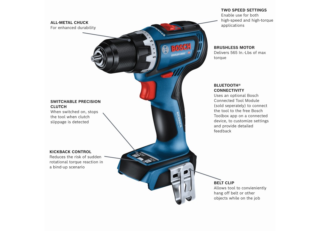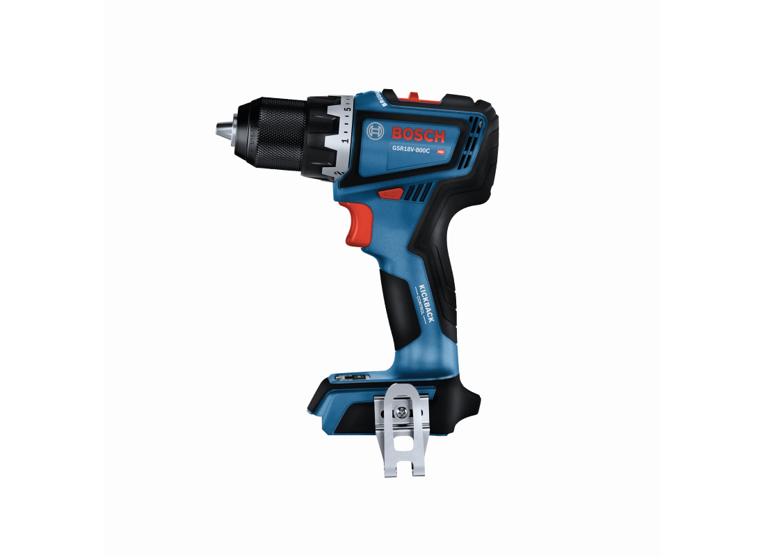 Facile à maîtriser, la puissante perceuse GSR18V-800CN Bosch offre une durabilité professionnelle. Dotée d’un puissant moteur sans balais très efficient, la perceuse délivre un couple maxi de 565 po-lb garantissant de très bonnes performances. Elle intègre le système KickBack Control qui réduit les risques liés à une réaction de couple brusque en cas de blocage du foret. Une puissante DEL assure une bonne visibilité dans les endroits sombres et l’embrayage de précision désactivable assure, quand il est activé, une maîtrise parfaite en arrêtant automatiquement l’outil dès qu’il se met à patiner. Le design compact et ergonomique confère une très bonne maniabilité et un grand confort d’utilisation. Les deux vitesses permettent de privilégier soit une vitesse élevée (0 à 2 100 tr/min), soit un couple élevé (0 à 630 Nm) et les 20+1 positions de présélection de couple garantissent une adaptation parfaite aux besoins de chaque application. Dotée d’un mandrin tout en métal, cette perceuse-visseuse est conçue pour durer.