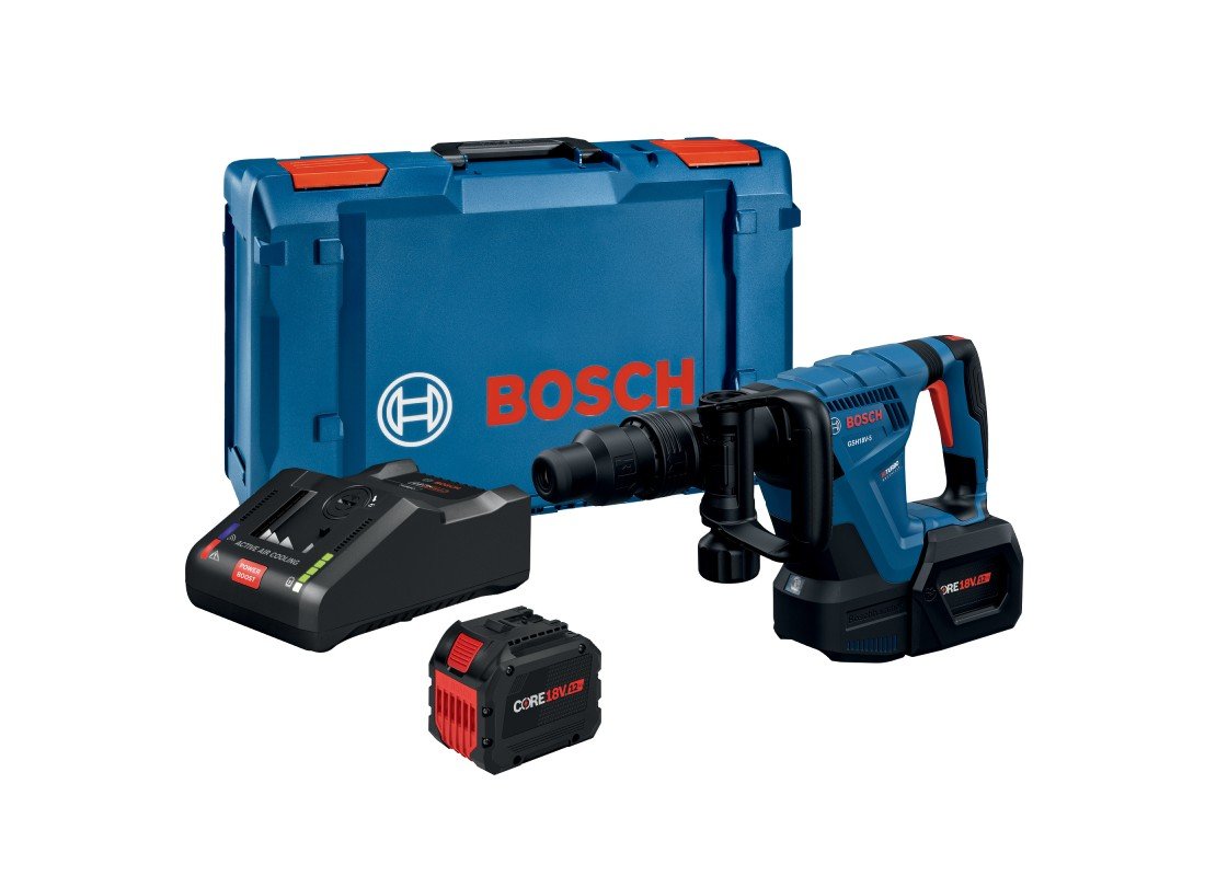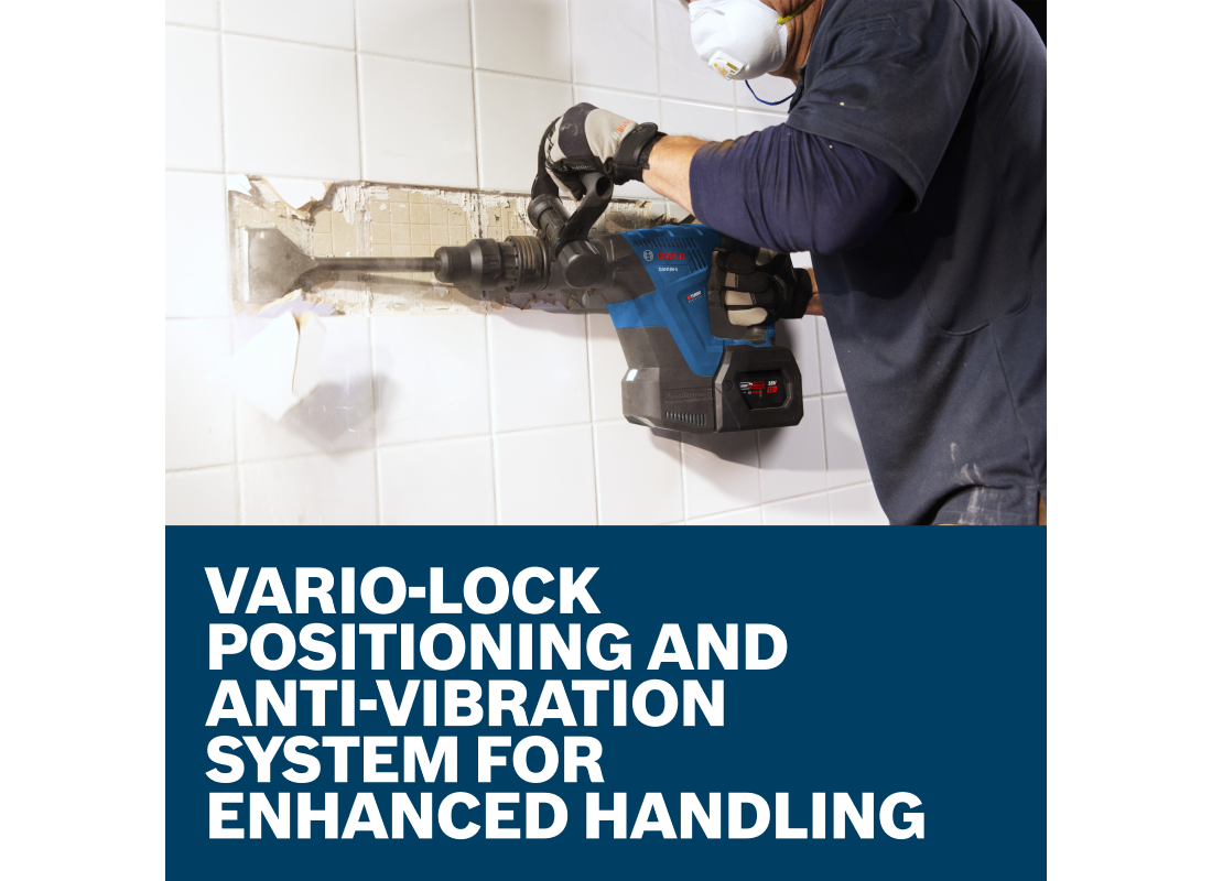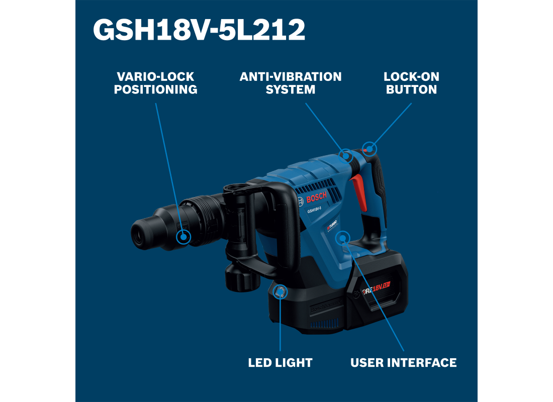 Avec le marteau perforateur SDS max® GSH18V-5L212 de Bosch, vous profitez de la puissance et de la maniabilité d’un outil PROFACTOR™ pour tous vos travaux de burinage. Ce perforateur est doté d’un moteur sans balais à haut rendement et à très bon rapport puissance/poids grâce à une force de frappe de 6,3 pi-lb (EPTA) et un poids de seulement 11,7 lb (outil seul). Le design compact et léger de l’outil lui permet d’être utilisable dans toutes les positions, vers le bas, à l’horizontale et à hauteur d’épaule, pour une polyvalence maximale. Le système antivibrations Vibration Control offre un confort accru. Le démarrage progressif et la fréquence de frappe régulée garantissent un burinage précis et le système Vario-Lock permet de tourner et bloquer le burin à l’angle de travail optimal pour plus de précision. Le bouton de blocage de la gâchette permet de maintenir l’outil en marche sans avoir à garder le doigt dessus, ce qui est très utile pour les utilisations prolongées. Entièrement compatible avec le système d’aspiration des poussières PRO+GUARD™ de Bosch contribuant à respecter la réglementation OSHA, Tableau 1, en matière de poussières de silice. L’ensemble est fourni avec un coffret L-BOXX-2 pour un transport sûr et un empilage simple en un clic, deux batteries PROFACTOR™ de 12 Ah garantissant des performances et une autonomie maximales et un chargeur turbo GAL18V-160.
