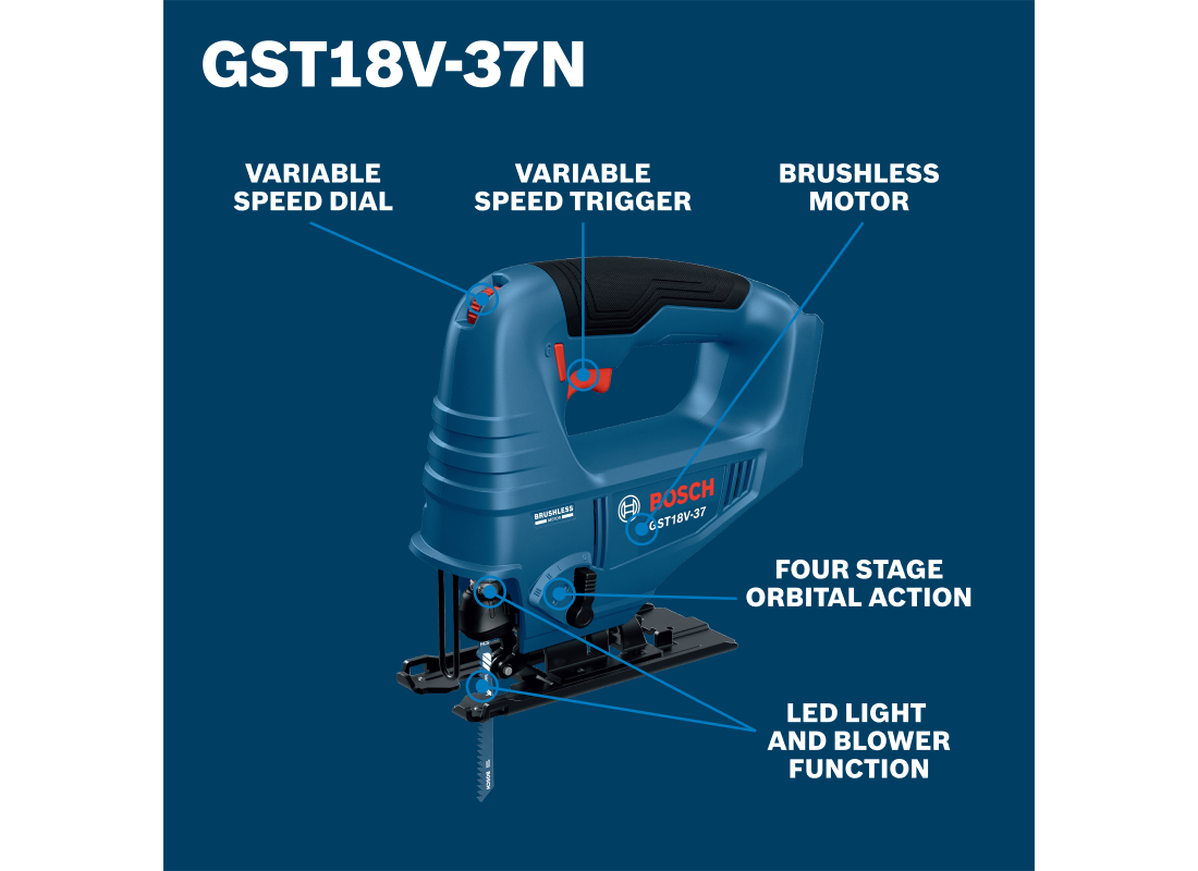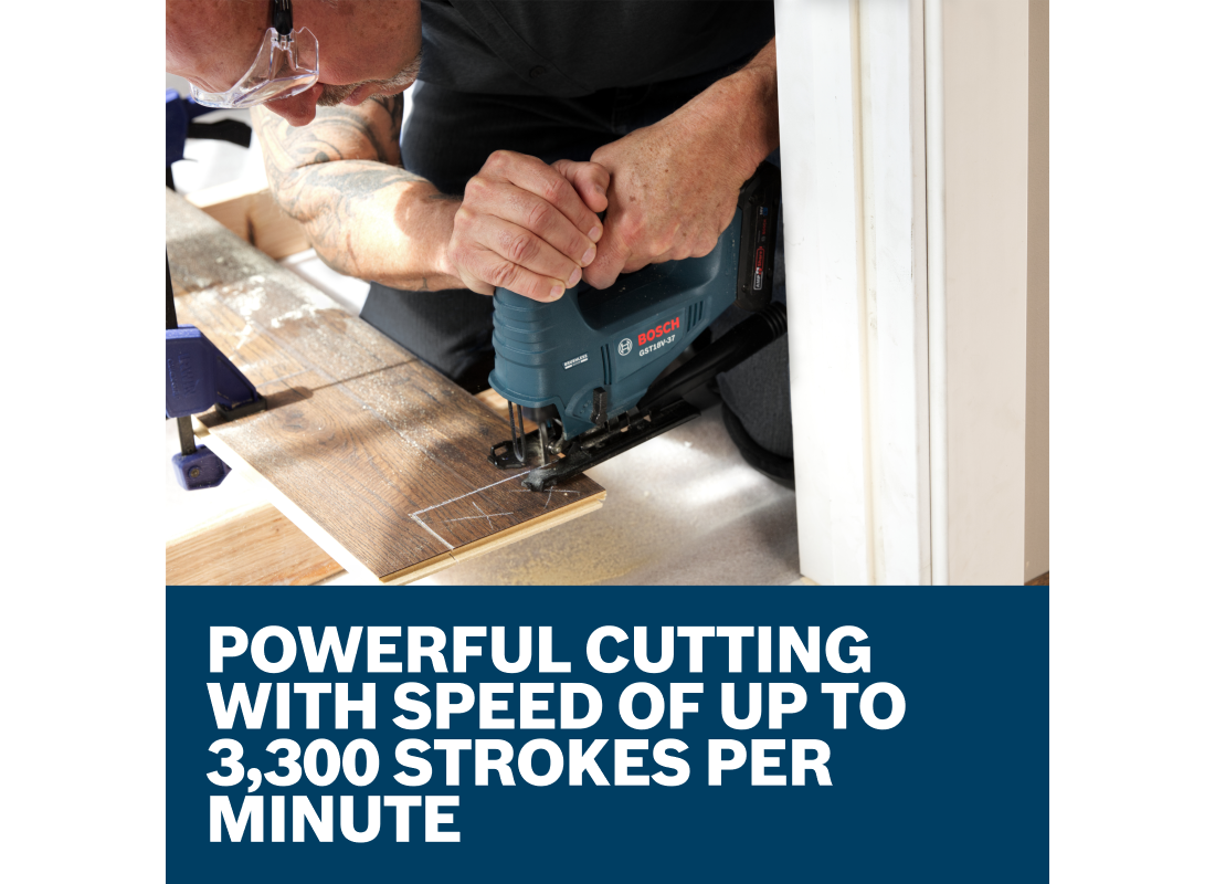 Optimisée pour les coupes courbées, la scie sauteuse à poignée étrier GST18V-37 18 V offre à la fois puissance et maîtrise, pour un fonctionnement fluide, même lors de la coupe de bois denses. Le moteur sans balais performant permet d'effectuer des coupes jusqu'à 3,7 po de profondeur avec un cadence de coupe jusqu'à 3 300 courses par minute. Afin de garantir des performances et une maîtrise optimales, la scie sauteuse dispose d'un mouvement pendulaire réglable dans 4 positions pour une grande polyvalence et d'une molette de présélection de vitesse permettant d'adapter la vitesse en fonction des exigences de chaque tâche. La cadence de coupe réduite en l'absence de charge assure une plus grande précision en début de coupe. Les lignes de coupe restent toujours visibles grâce à la DEL d'éclairage et à la soufflerie intégrée. Le système de changement de lame rapide et facile, sans outil, permet de minimiser les temps d'arrêt sur le chantier.