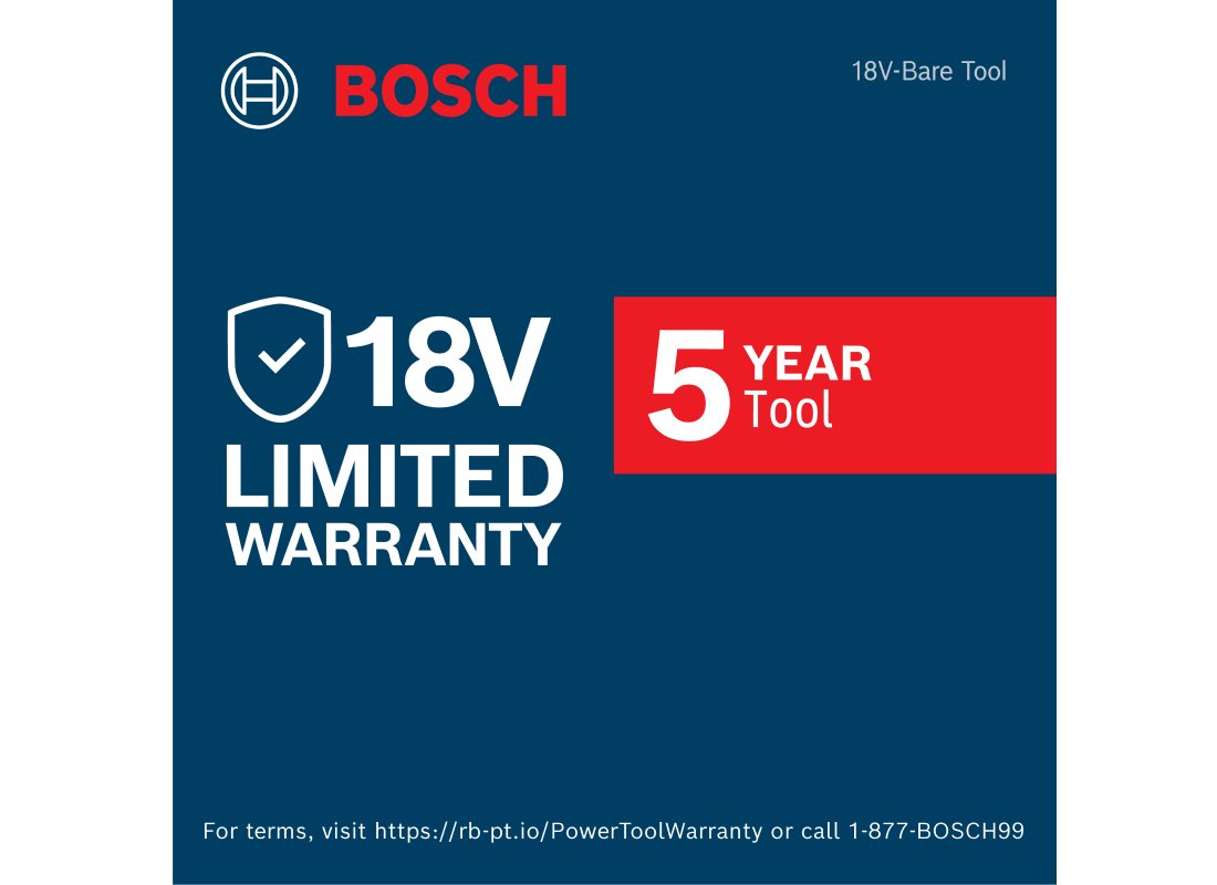 • Les outils électroportatifs sans fil 18V Bosch bénéficient d’une garantie de 5 ans. Pour plus de détails, rendez-vous sur https://rb-pt.io/PowerToolWarranty ou appelez le 1-877-BOSCH99