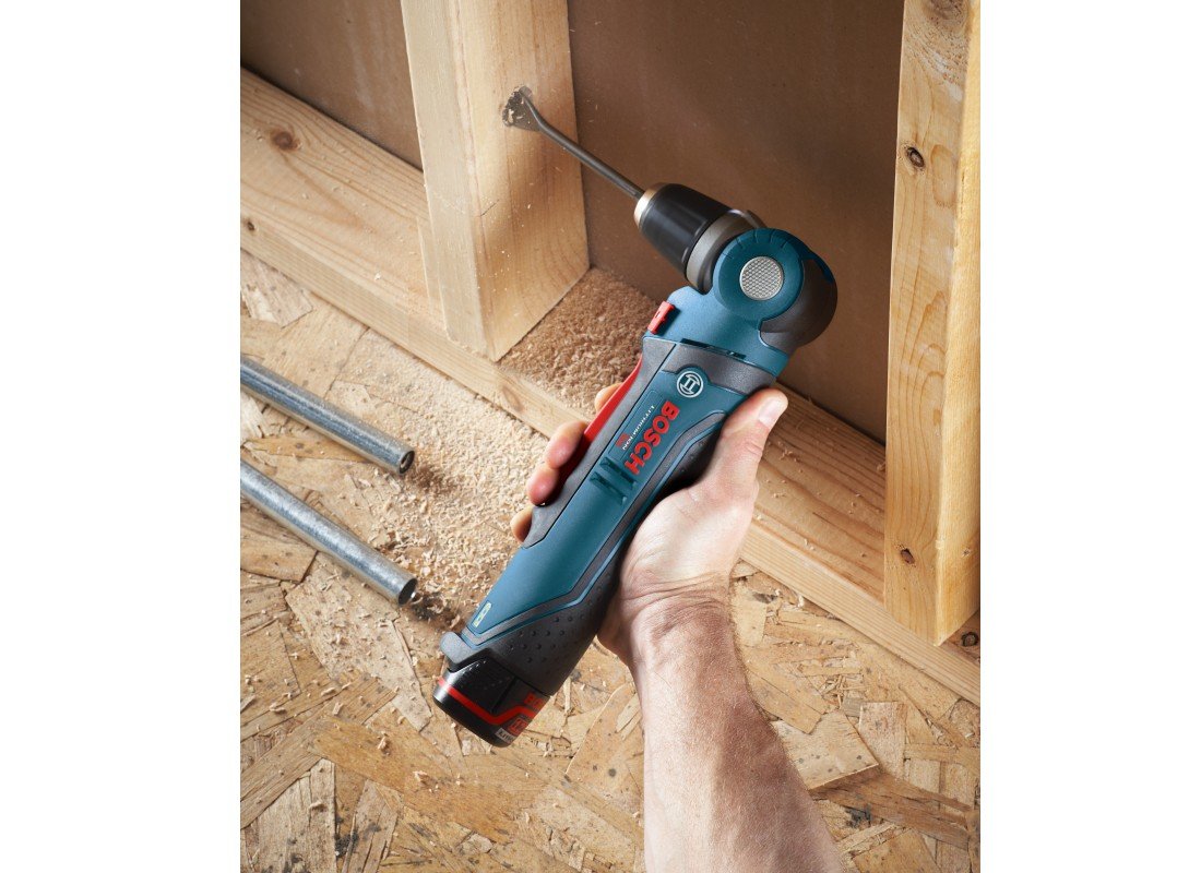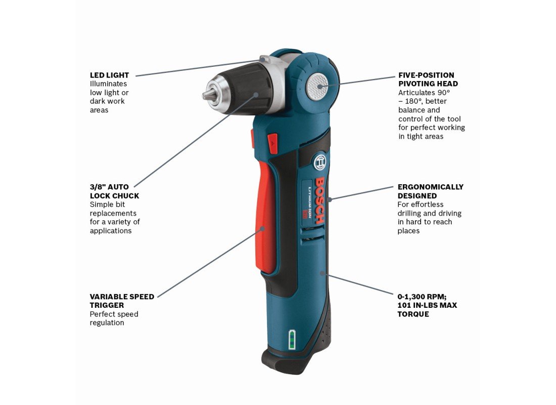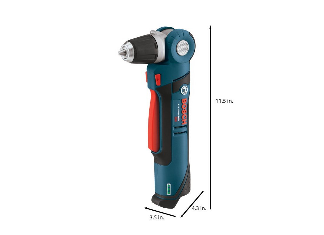 La perceuse à angle droit 12 V Max de 3/8 po PS11 Bosch PS11 possède une tête orientable de 90°, blocable dans 5 positions, pour aller dans les endroits inaccessibles avec les autres perceuses. Avec un poids de seulement 2,4 lb (outil seul, sans batterie), un régime à vide de 0-1 300 tr/min et un couple maxi de 115 po-lb, cette perceuse est conçue pour les petits travaux de vissage de précision. Elle possède un mandrin Auto-Lock de 3/8 po, une gâchette de variation de vitesse et deux DEL qui pivotent avec le mandrin assurant un éclairage parfait dans les endroits sombres. Il s’agit d’un ensemble outil seul ; la batterie et le chargeur sont vendus séparément.