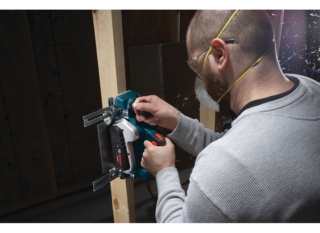 La raboteuse 3-1/4 po PL1632 est adaptée pour les professionnels qui ont besoin de raboter des portes ou d’autres surfaces rapidement et de façon uniforme. Elle allie performance, maniabilité et sécurité et dispose d’un système de guidage très pratique. Elle est dotée d’un puissant moteur de 6,5 A, qui produit 16 500 tr/min pour l’élimination rapide des copeaux et une finition en douceur. Elle dispose d’un bouton de verrouillage ambidextre empêchant les démarrages accidentels et d’un bouton de marche continue permettant une utilisation prolongée sans fatigue – une combinaison unique sur les raboteuses Bosch. La partie avant en aluminium et les sabots arrière sont usinés ensemble pour une bonne précision, et l’outil est doté d’une rainure usinée pour le chanfreinage. Sa conception de lame équilibrée positionne la lame selon un angle de coupe idéal et élimine le rabotage non uniforme causé par des lames mal alignées. Elle est fournie avec un fer au carbure micrograin réversible Woodrazor de Bosch. L’outil comprend également un stand monté sur ressorts qui élève la raboteuse afin de protéger la lame. Le guide longitudinal double peut être monté de chaque côté, avec un recouvrement en plastique permettant de protéger la surface de la pièce. Au niveau du raccord d’aspiration peut être fixé un grand sac à copeaux. Cette raboteuse intègre une courroie d’entraînement à "V" multiple pour une durée de vie prolongée de la courroie et une articulation avec roulement pour une plus grande facilité de positionnement de l’outil et du cordon.