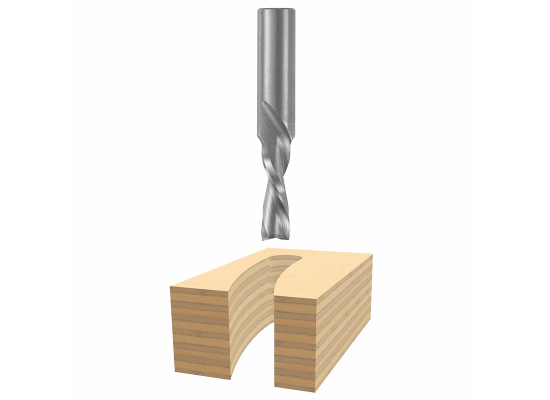 L’embout au carbure micrograiné de qualité supérieure est affûté avec précision pour une finition très soignée avec une finesse maximale et une netteté des bords. La fraise à spirale descendante est utilisée pour que les copeaux descendent vers le bas et pour produire une finition optimale sur la partie supérieure de la pièce à travailler. Le cisaillage produit une coupe particulièrement nette et précise, tandis que le mouvement hélicoïdal permet d’enlever les copeaux.